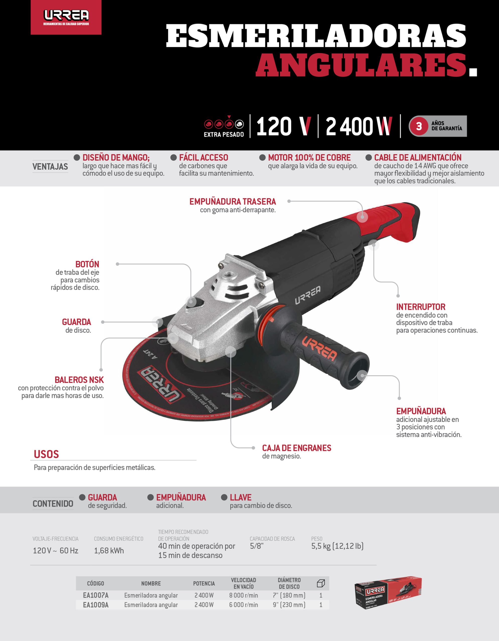 Esmeriladora angular 9″ 2400 W 120 V, 6000 RPM Urrea