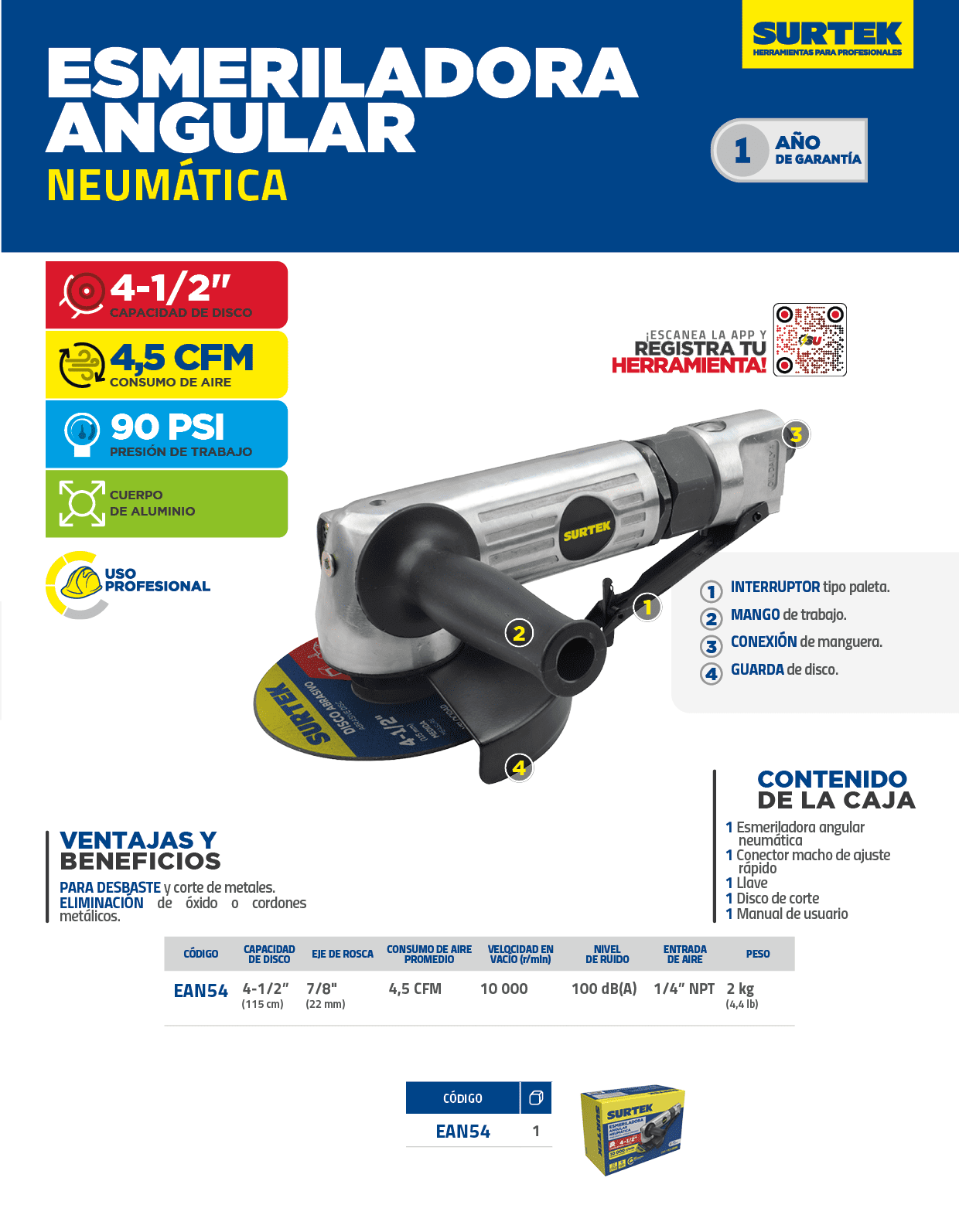 Esmeriladora neumática angular para discos con diámetro de 4″ 11,000 RPM Surtek