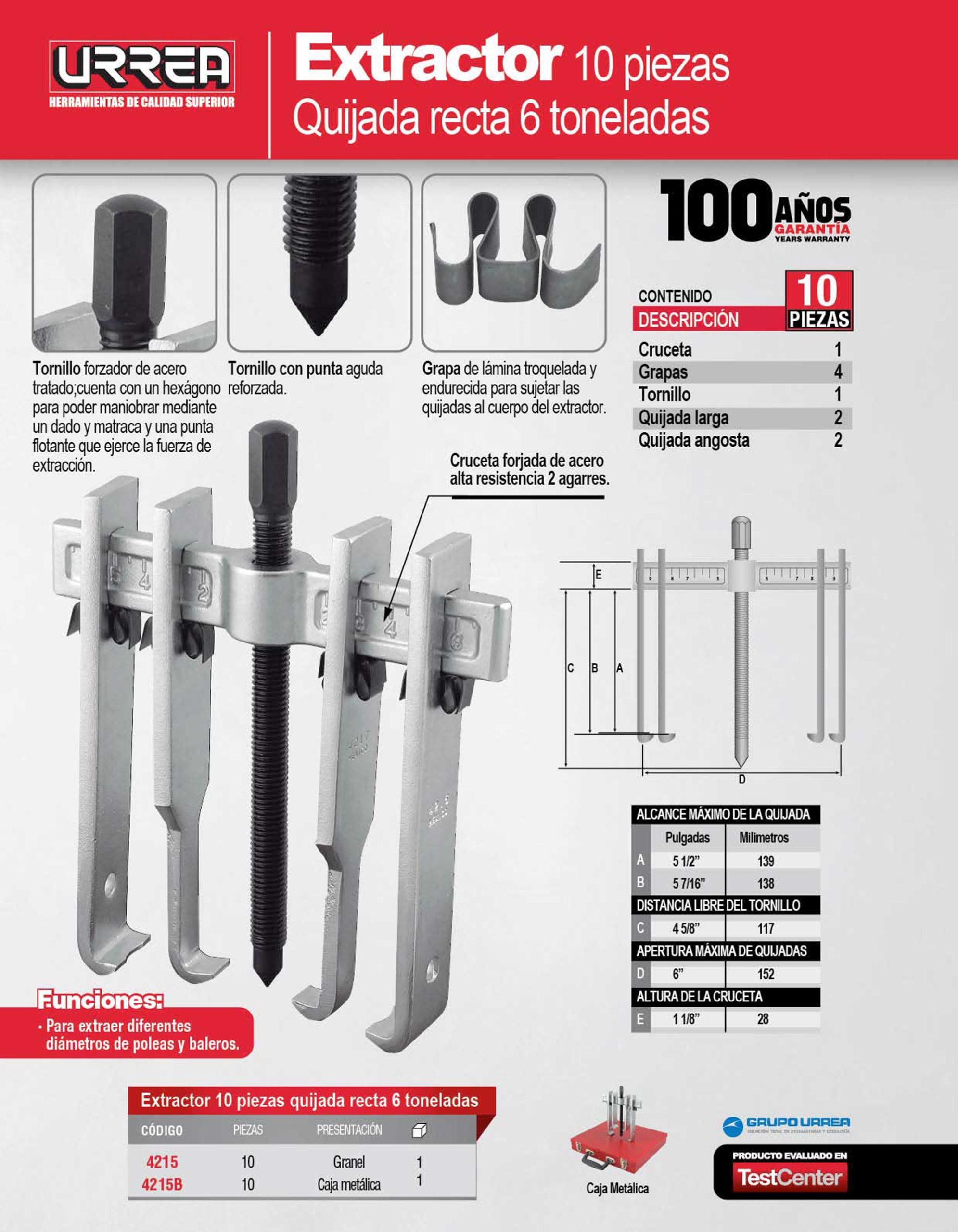 Extractor quijada recta tipo “A” 6 ton, 11 piezas en caja metálica Urrea