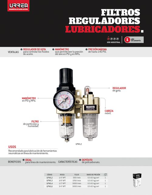 Filtro regulador y lubricador de aire 1/4″ NPT Urrea