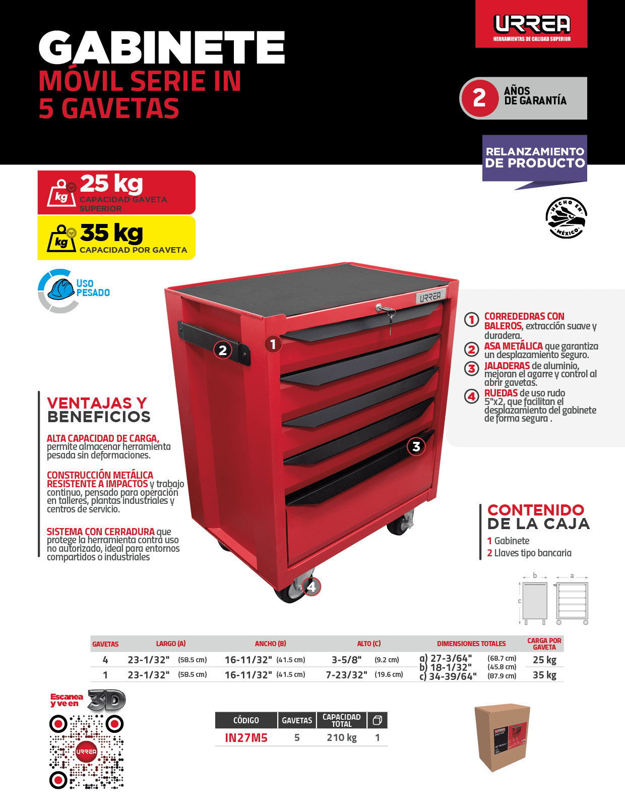 Gabinete móvil con 5 gavetas color rojo y negro 27″ serie IN Urrea