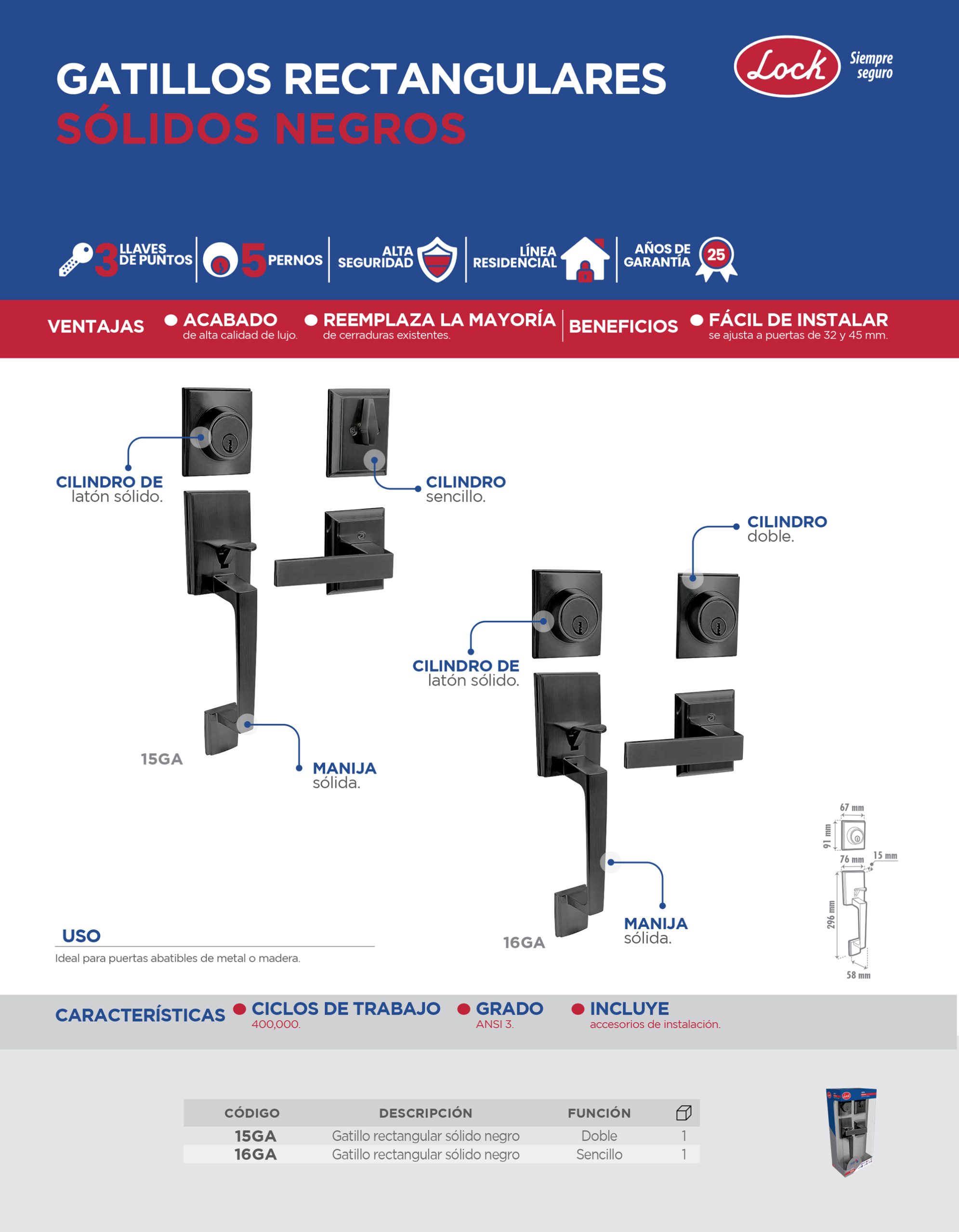 1 cerradura de gatillo, 3 llaves estándar, tornillería y accesorios, instructivo y plantilla.