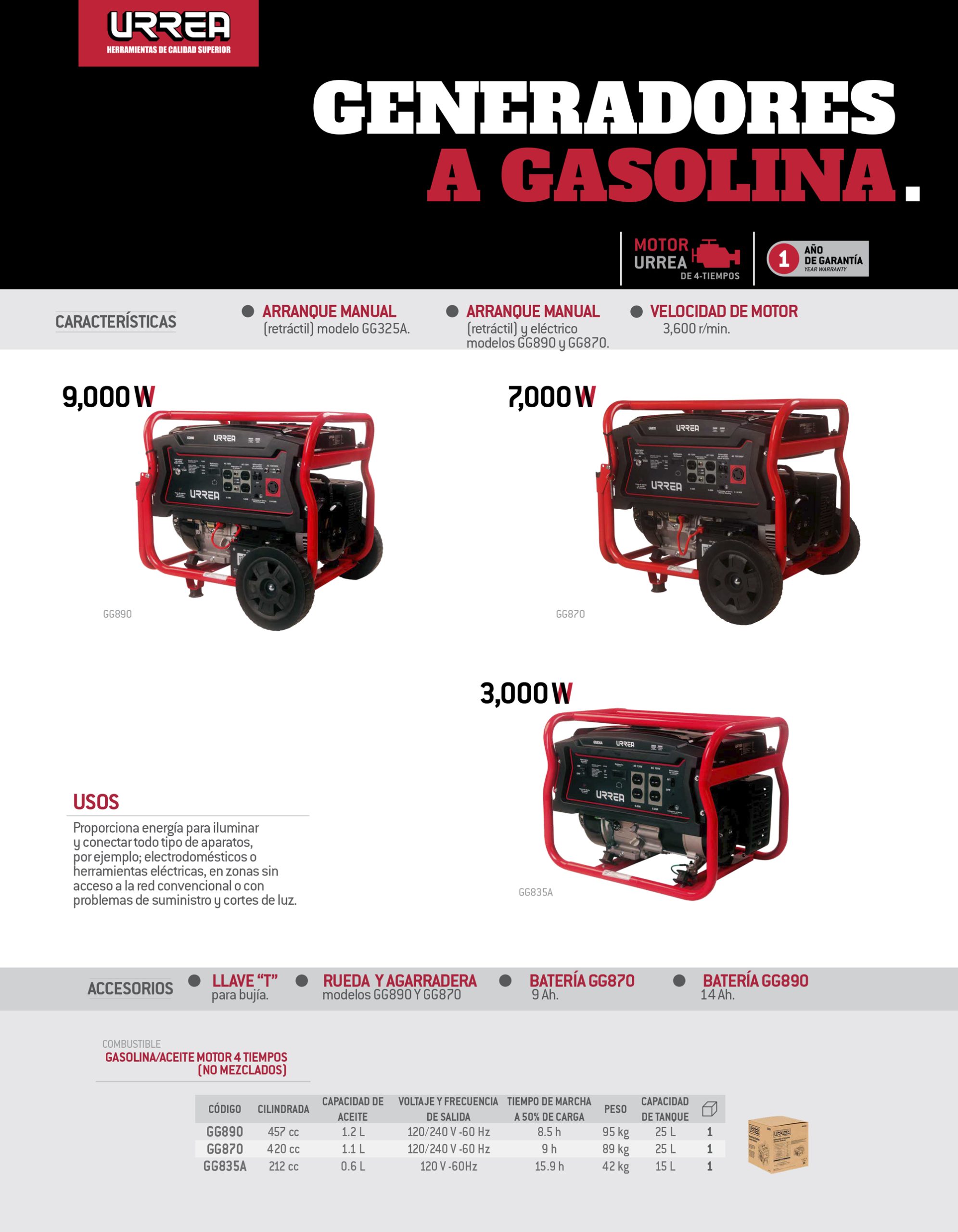 Generador a gasolina 7000 W, 420 cc, voltaje de salida 120-240 V Urrea