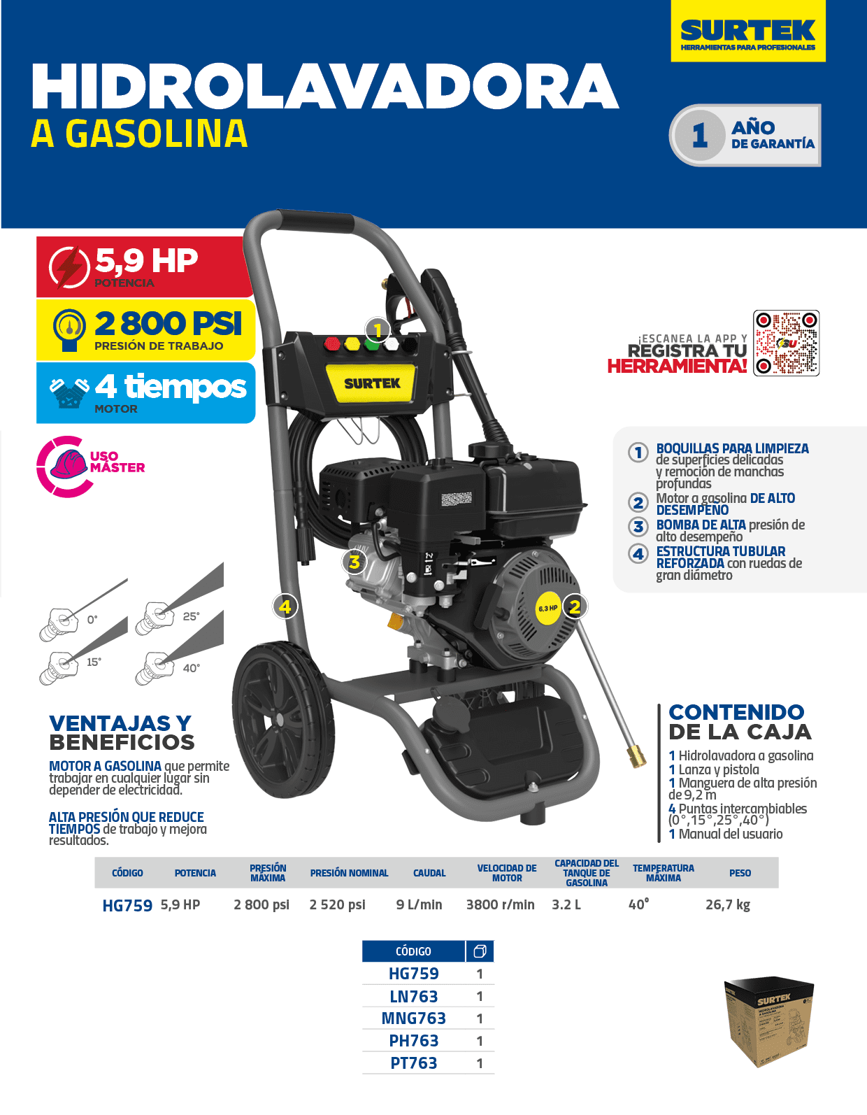 Hidrolavadora a gasolina 5.9 HP 2800 PSI, 9 Lt por minuto Surtek