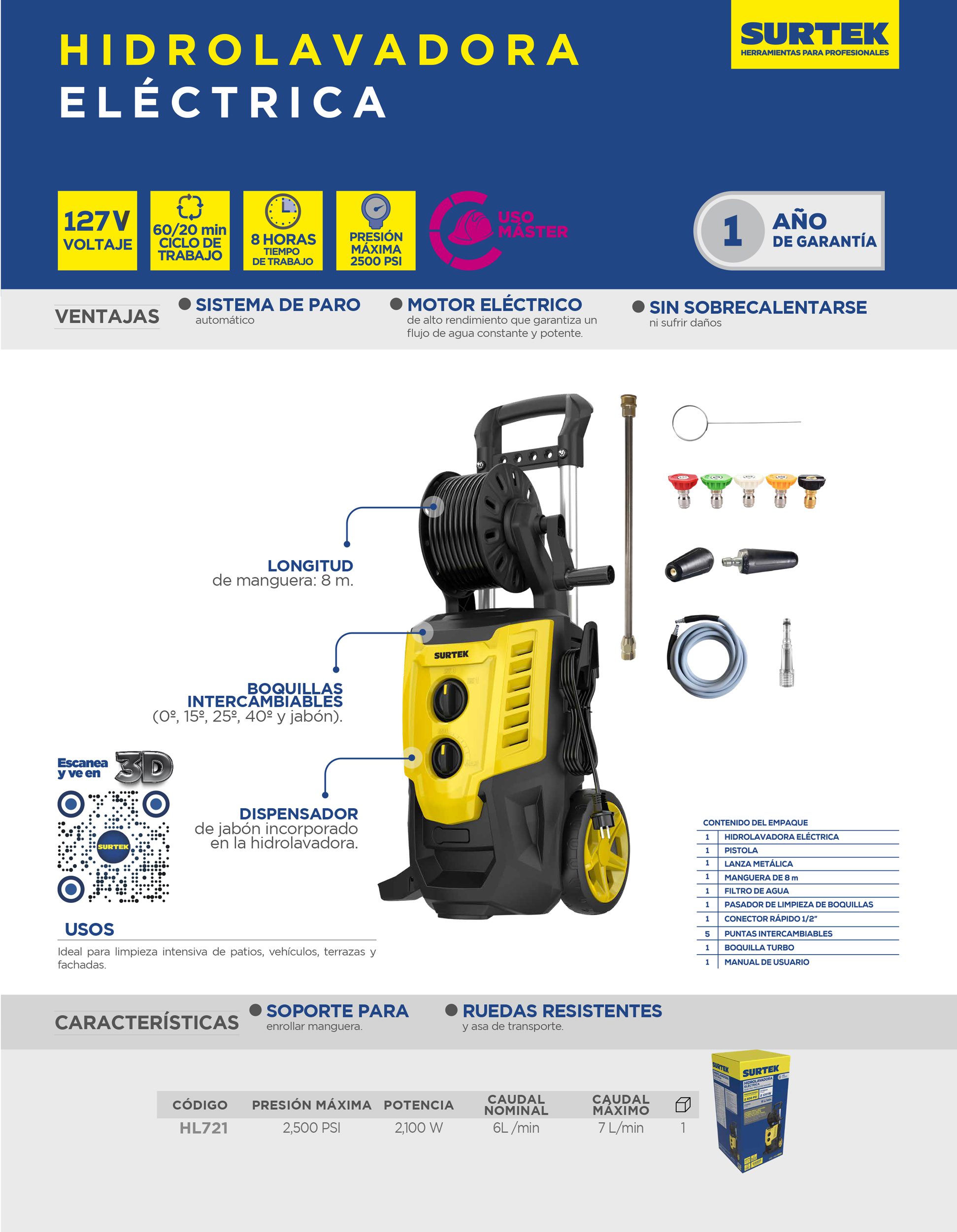 Hidrolavadora eléctrica 2100 W 127 V 2500 PSI, 6 Lt por minuto Surtek