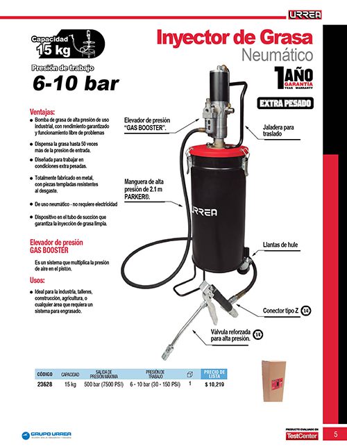 Inyector de grasa con cubeta neumático de 15 kg, 7,500 PSI Urrea