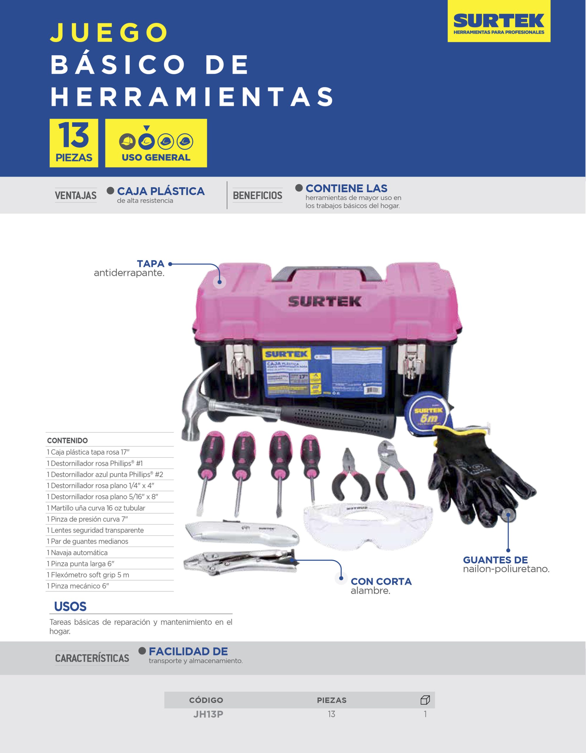 CPS17K Caja plástica rosa 17x9x8″ 1pz. D243P Destornillador rosa Phillips #1 3/16×3″ 1pz. D245P Destornillador rosa Phillips #2 1/4×4″ 1pz. D204P Destornillador rosa plano 1/4×4″ 1pz. D205P Destornillador rosa plano 5/16×6 1pz. 416TN Martillo uña curva 16oz tubular 1pz. 115083 Pinza presión curva 7″ 1pz. 137323 Lentes seguridad transparente 1pz. 137404 Guantes nailon c/nitrilo M 1pz. NF9 Navaja utilitaria automática 1pz. 926P Pinza punta larga 6″ rosa 1pz. PM06P Pinza mecánico 6″ rosa 1pz. B122064 Flexómetro soft grip 5m 1pz.