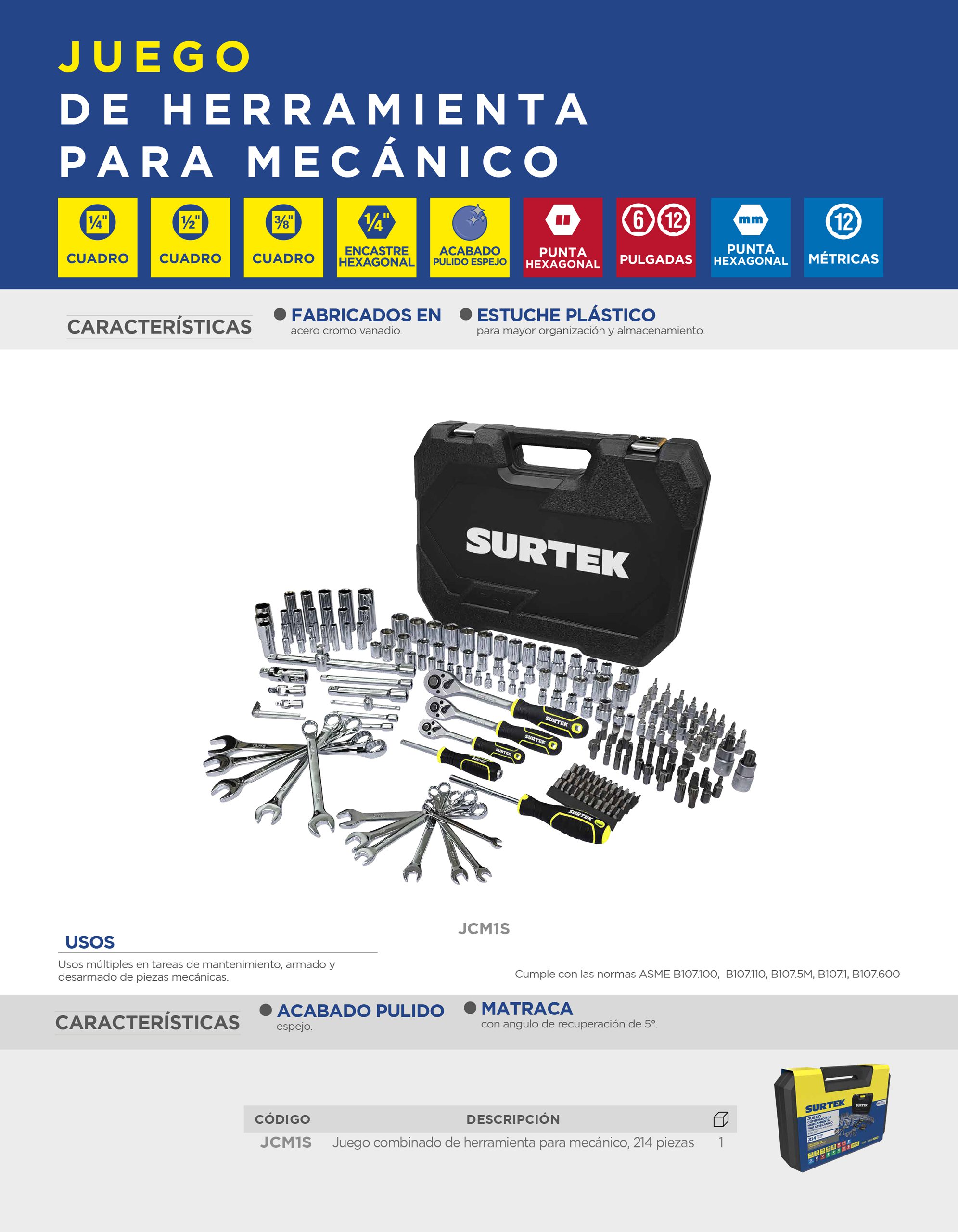 Juego combinado de herramienta para mecánico 214 piezas, con maletín plástico Surtek