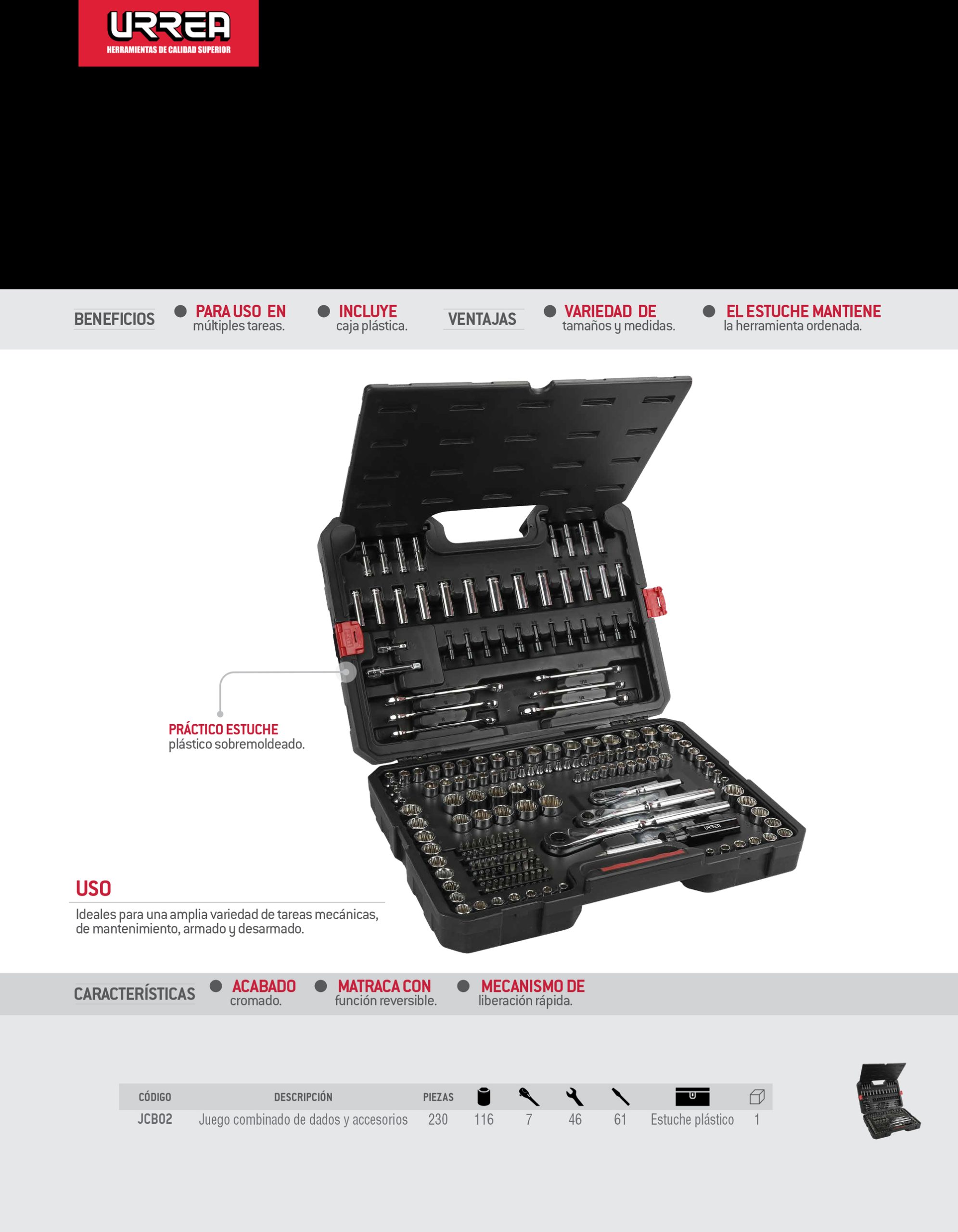 Juego combinado de herramienta para mecánico 230 piezas, con maletín plástico Urrea