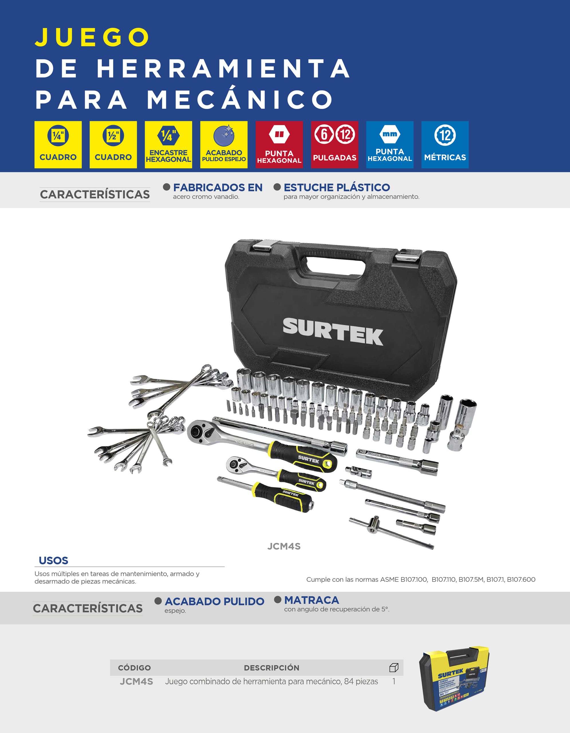 Juego combinado de herramienta para mecánico 84 piezas, con maletín plástico Surtek