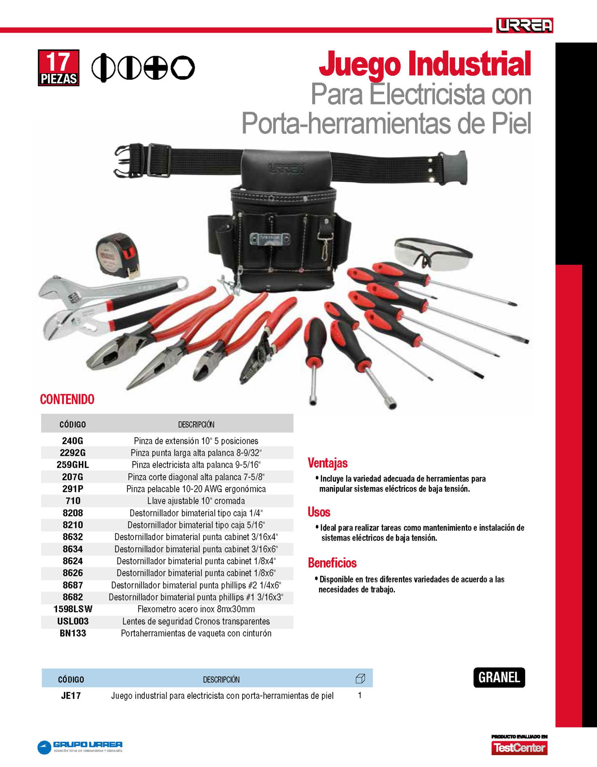 Juego combinado de herramientas para electricista 17 piezas, en portaherramientas Urrea