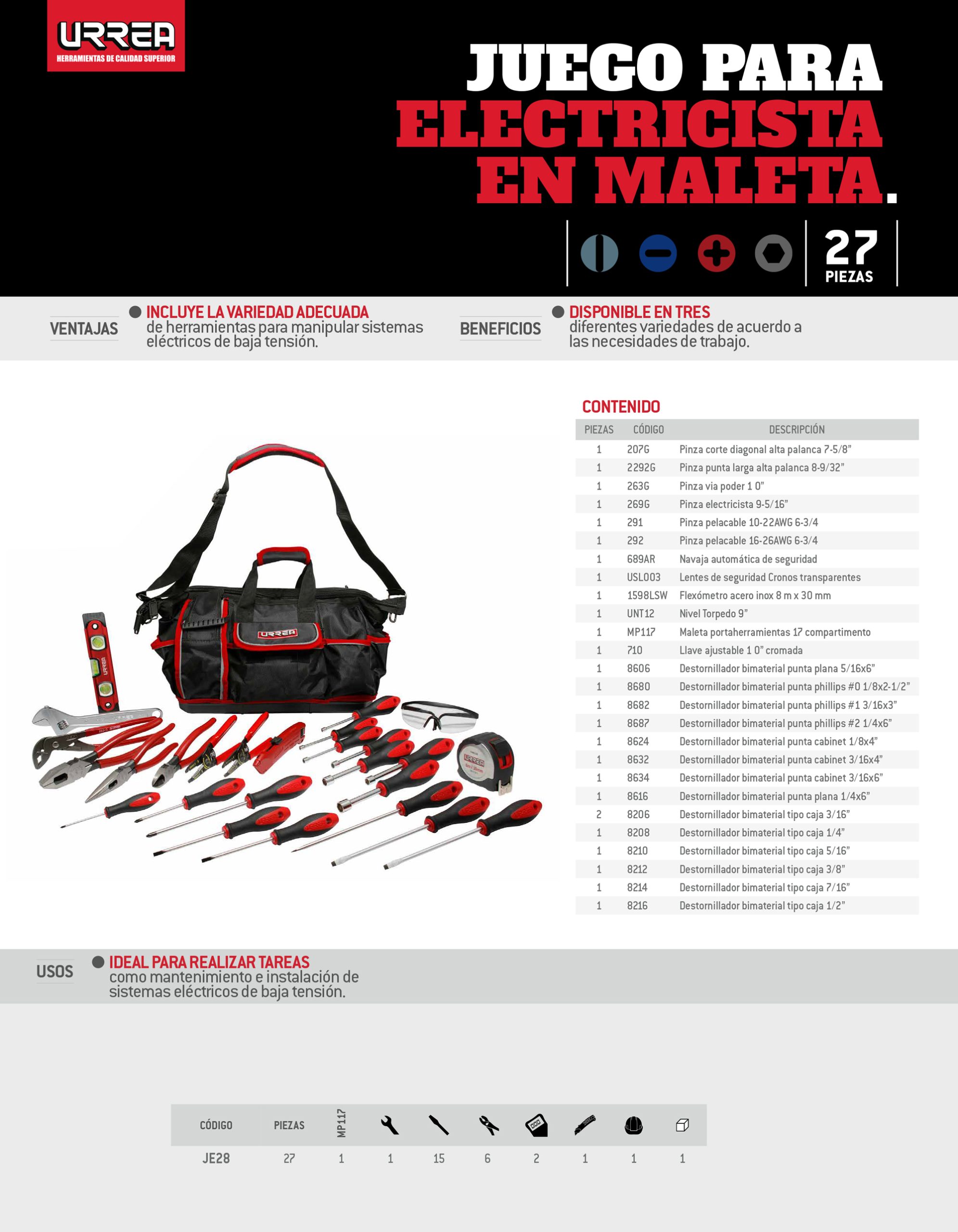 Juego combinado de herramientas para electricista 27 piezas , en maleta Urrea