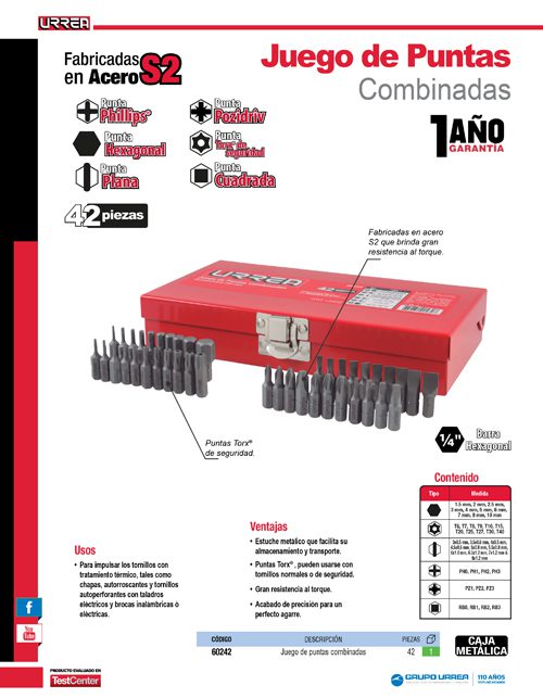 Juego combinado de puntas hexágono de 1/4″, 42 piezas en caja metalica Urrea