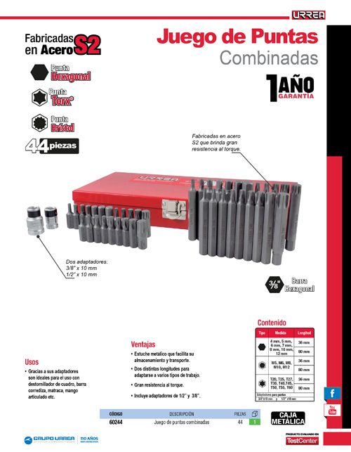 Juego combinado de puntas hexágono de 3/8″ con adaptadores, 44 piezas en caja metalica Urrea