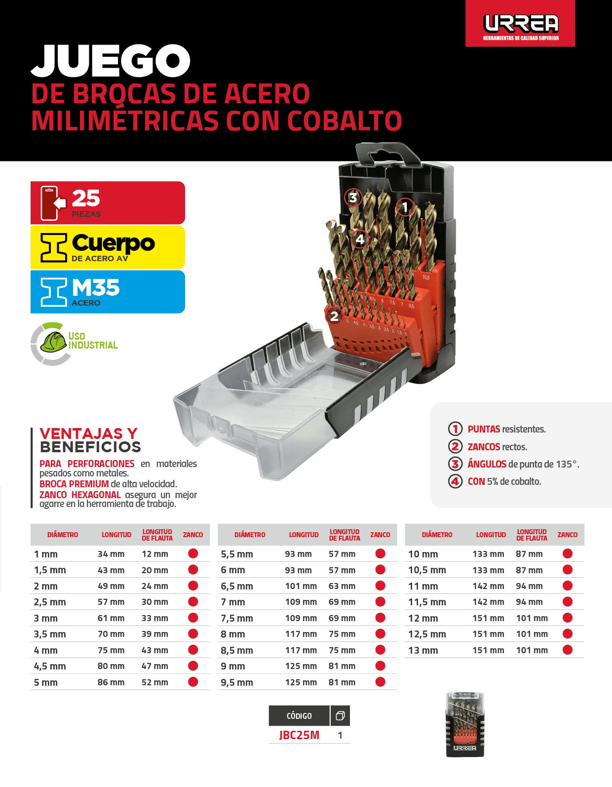 Juego de brocas con cobalto de acero de alta velocidad métricas zanco recto, 25 piezas Urrea