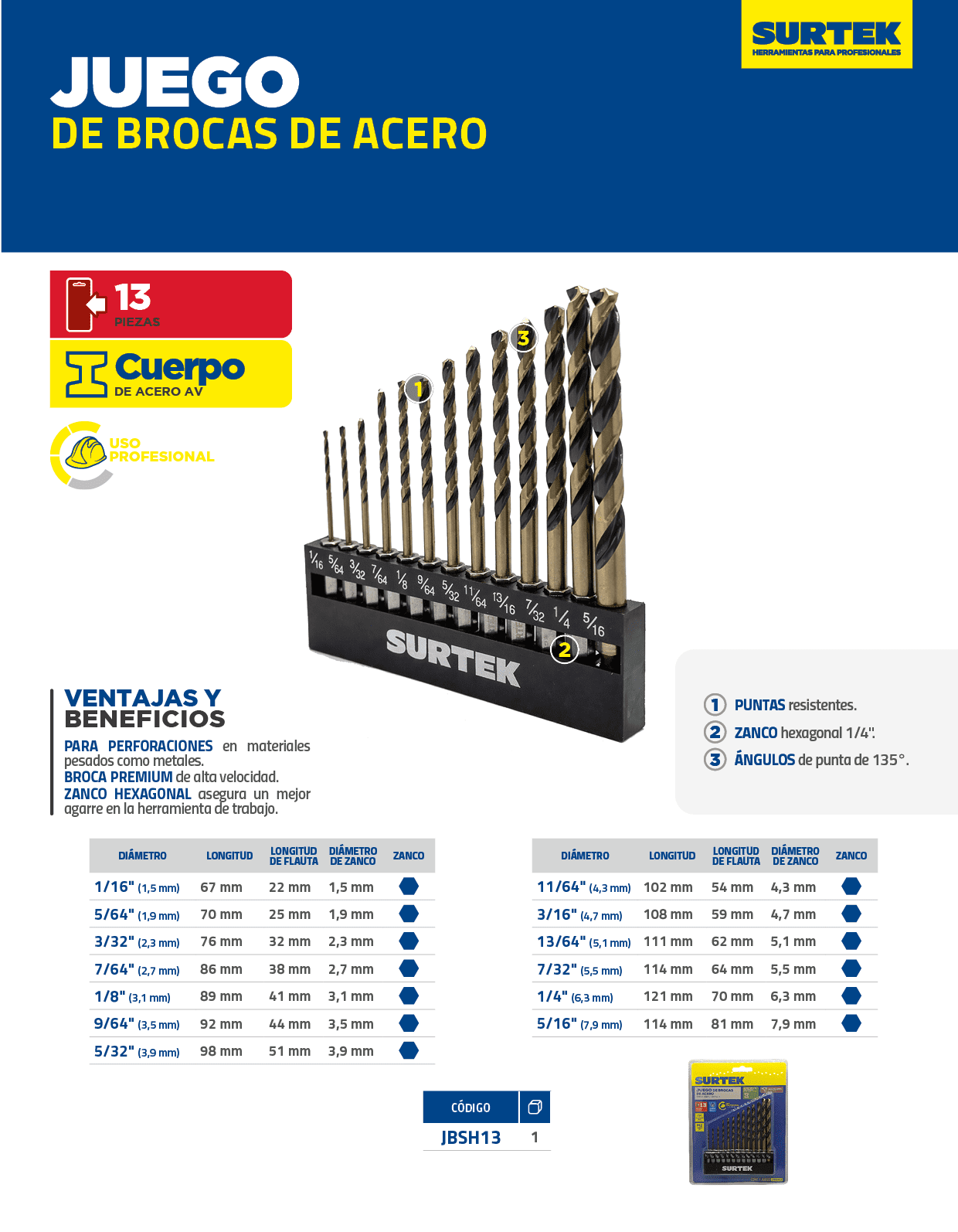 Juego de brocas de acero de alta velocidad zanco hexagonal, 13 piezas Surtek