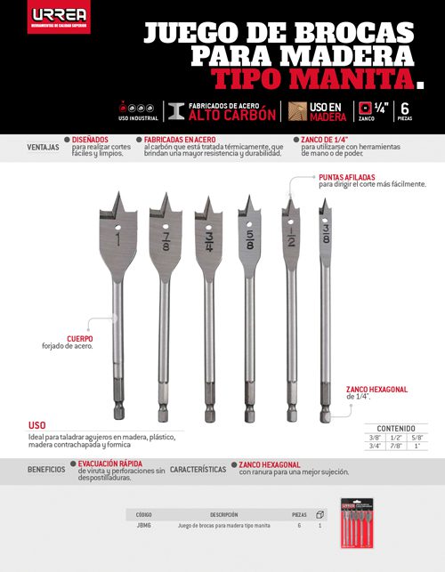 Juego de brocas para madera de acero al carbono tipo manita, 6 piezas Urrea