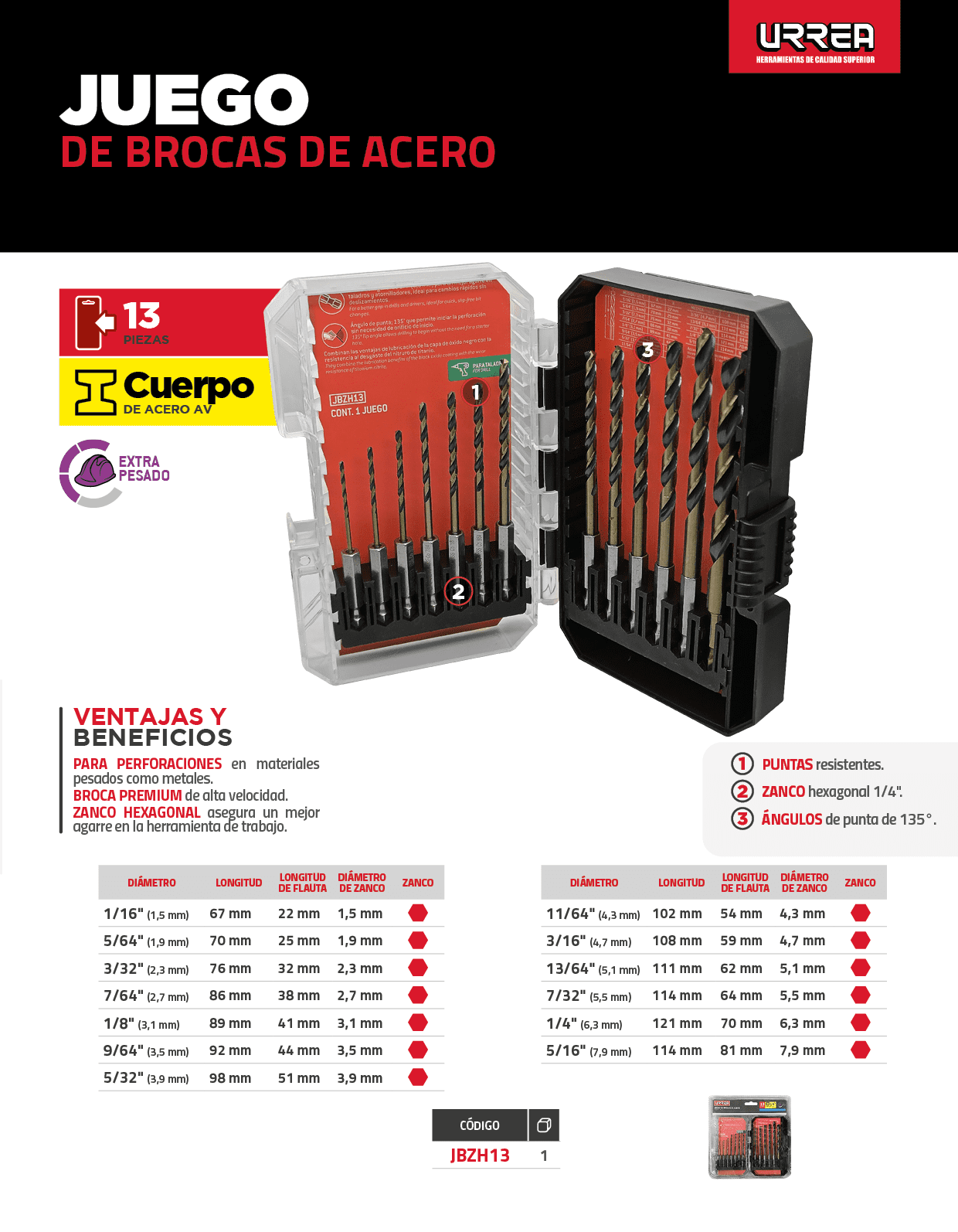 Juego de brocas premium de acero de alta velocidad zanco hexagonal, 13 piezas Urrea