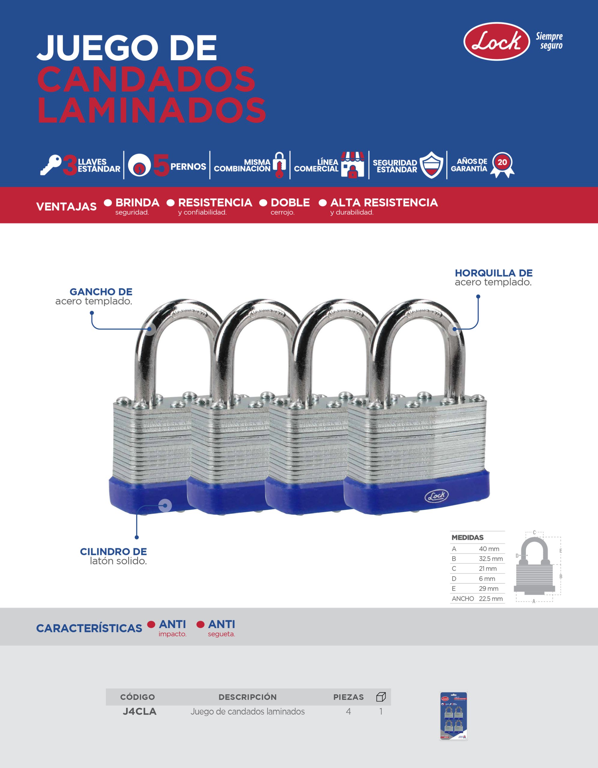 Juego de candados laminados 40 mm, llave estándar, 4 piezas Lock