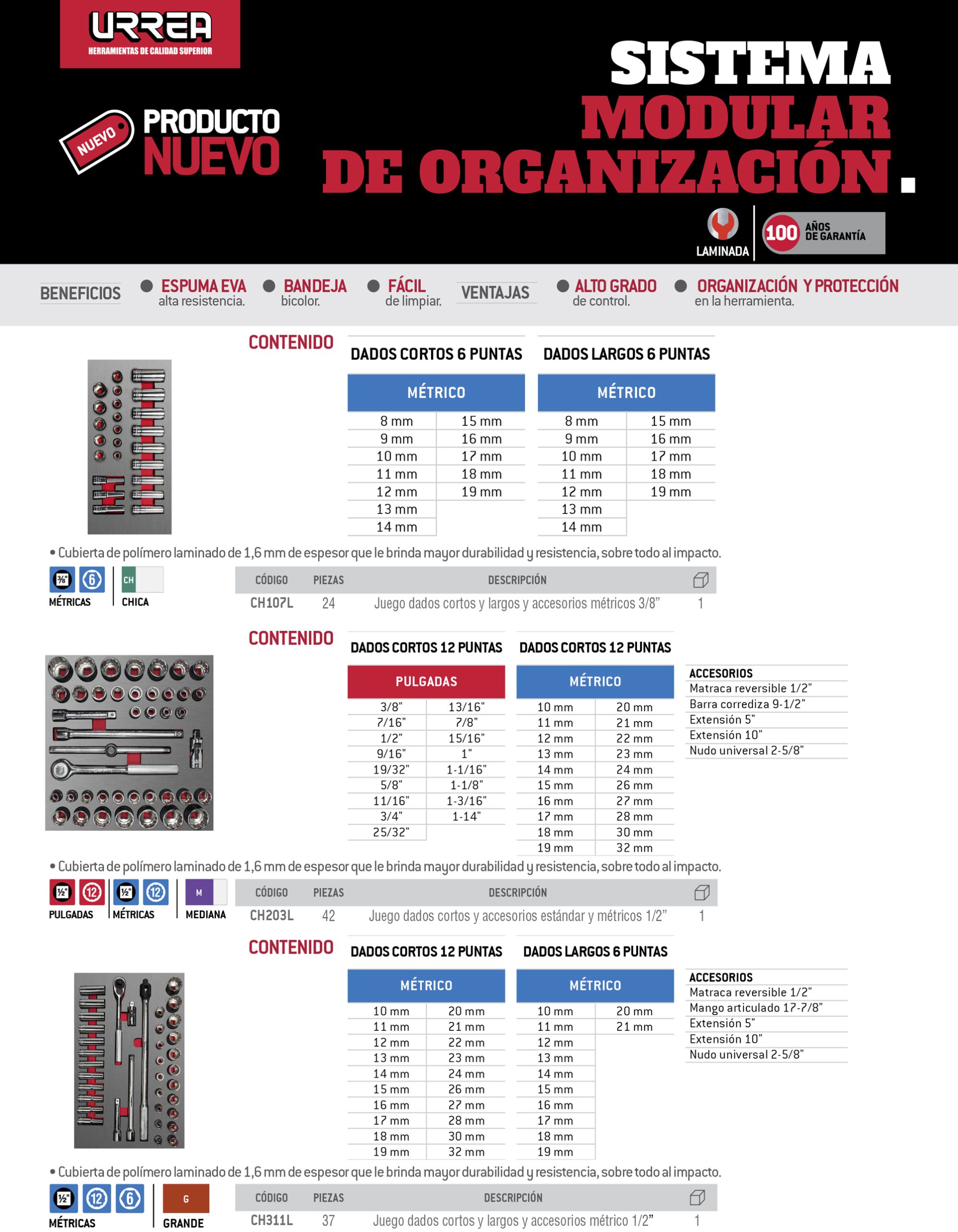 Dado 1/2″ 12pts: 10mm, 11mm, 12mm, 13mm, 14mm, 15mm, 16mm, 17mm, 18mm, 19mm, 20mm, 21mm, 22mm, 23mm, 24mm, 26mm, 27mm, 28mm, 30mm, 32mm, 3/8″, 7/16″, 1/2″, 9/16″, 19/32″, 5/8″, 1/16″, 3/4″, 25/32″, 13/16″, 7/8″, 15/16″, 1″, 1-1/16″, 1-1/8″, 1-3/16″, 1-1/4″. Matraca 1/2″ rev redonda. Barra corrediza 1/2″ x 9-1/2″. Extensión de 1/2″ x 5″; Extensión 1/2″x10″. Nudo universal 2-5/8″.