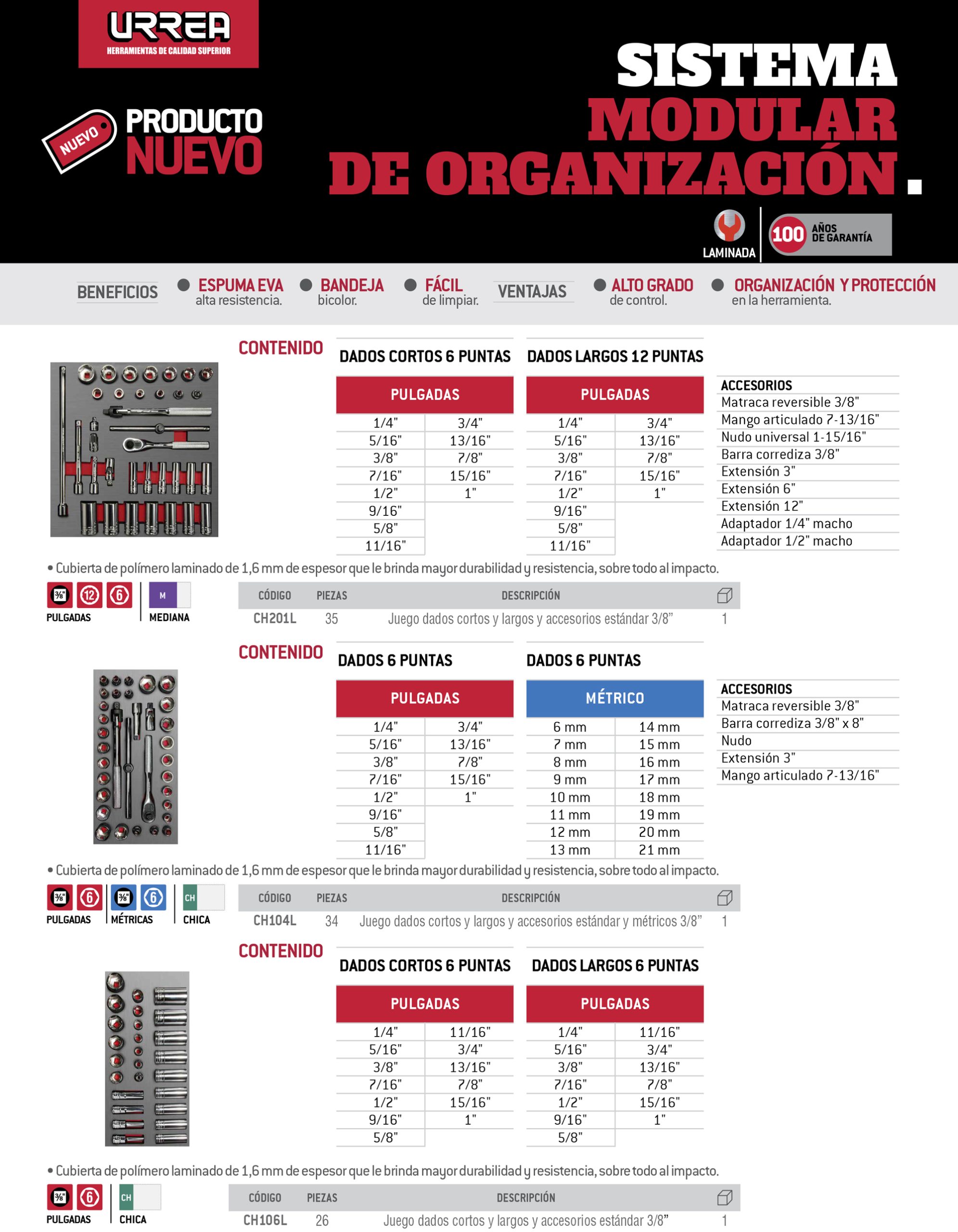 Juego de dados cortos,largos y accesorios cuadro de 3/8″ en pulgadas 35 piezas, CH201L-C Urrea