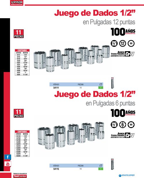 Juego de dados cuadro de 1/2″, 6 puntas, en pulgadas, 11 piezas Urrea