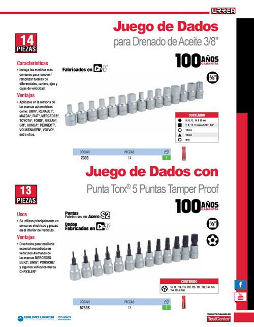 Juego de dados cuadro de 3/8″ para drenado de aceite, 14 piezas Urrea