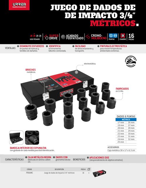Juego de dados de impacto cuadro de 3/4″, 6 puntas, métricos, 15 piezas Urrea