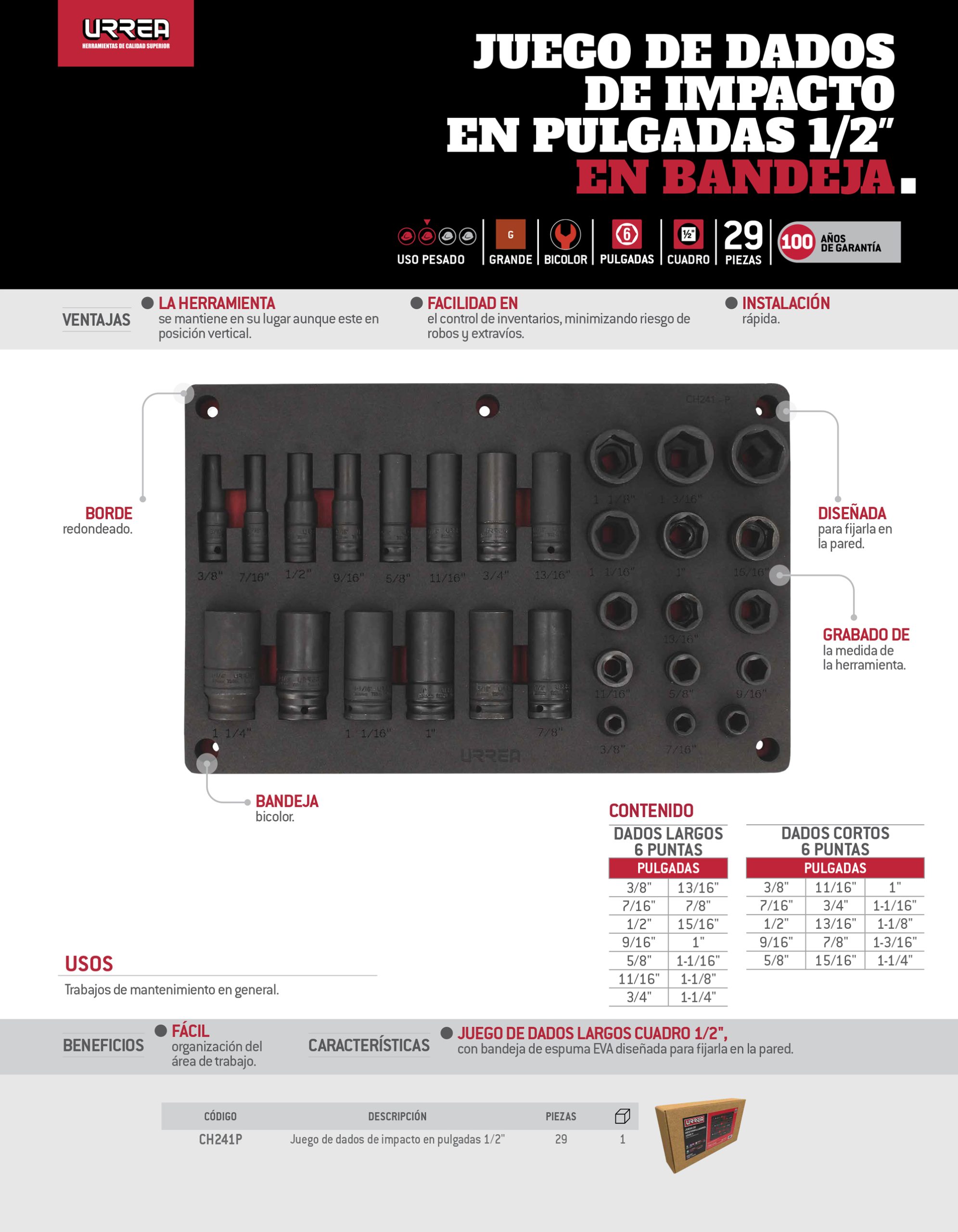 Juego de dados de impacto en pulgadas cuadro de 1/2″ 29 piezas, CH241P-C Urrea