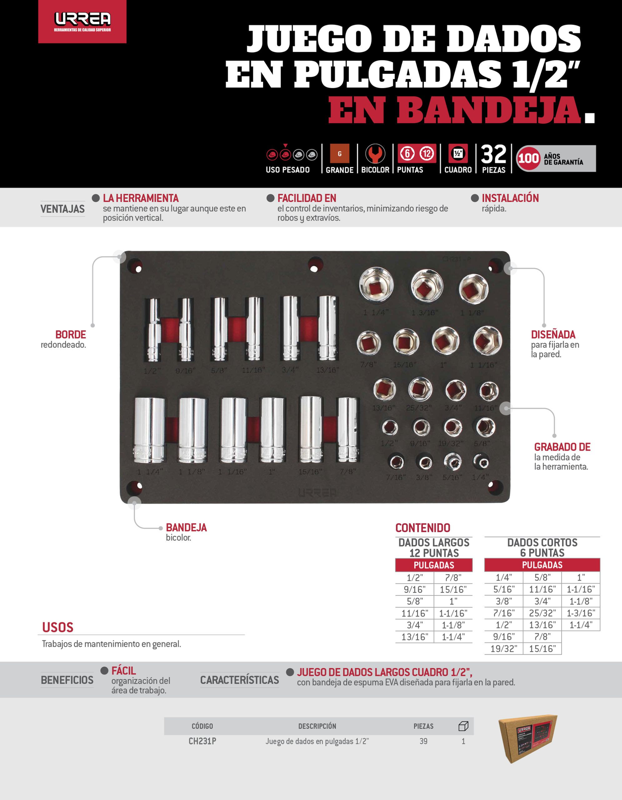 Juego de dados en pulgadas cuadro de 1/2″ 32 piezas, CH231P-C Urrea