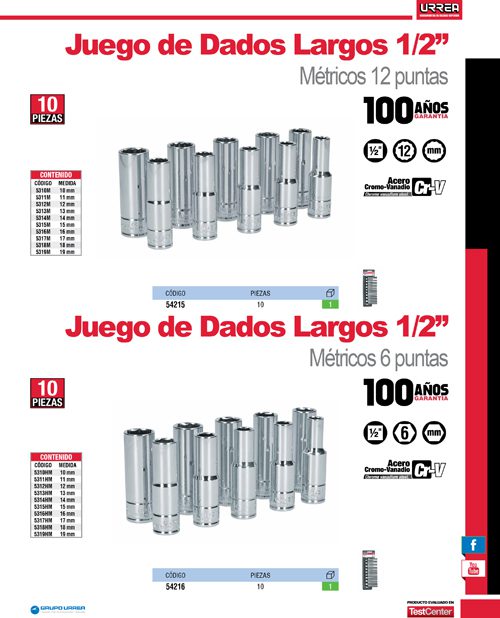 Juego de dados largos cuadro de 1/2″, 6 puntas, métricos, 10 piezas Urrea