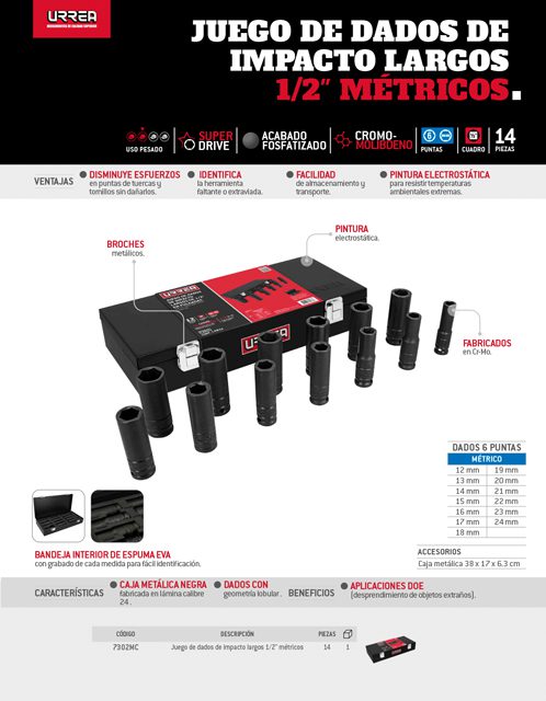 Juego de dados largos de impacto cuadro de 1/2″, 6 puntas, métricos, 13 piezas Urrea