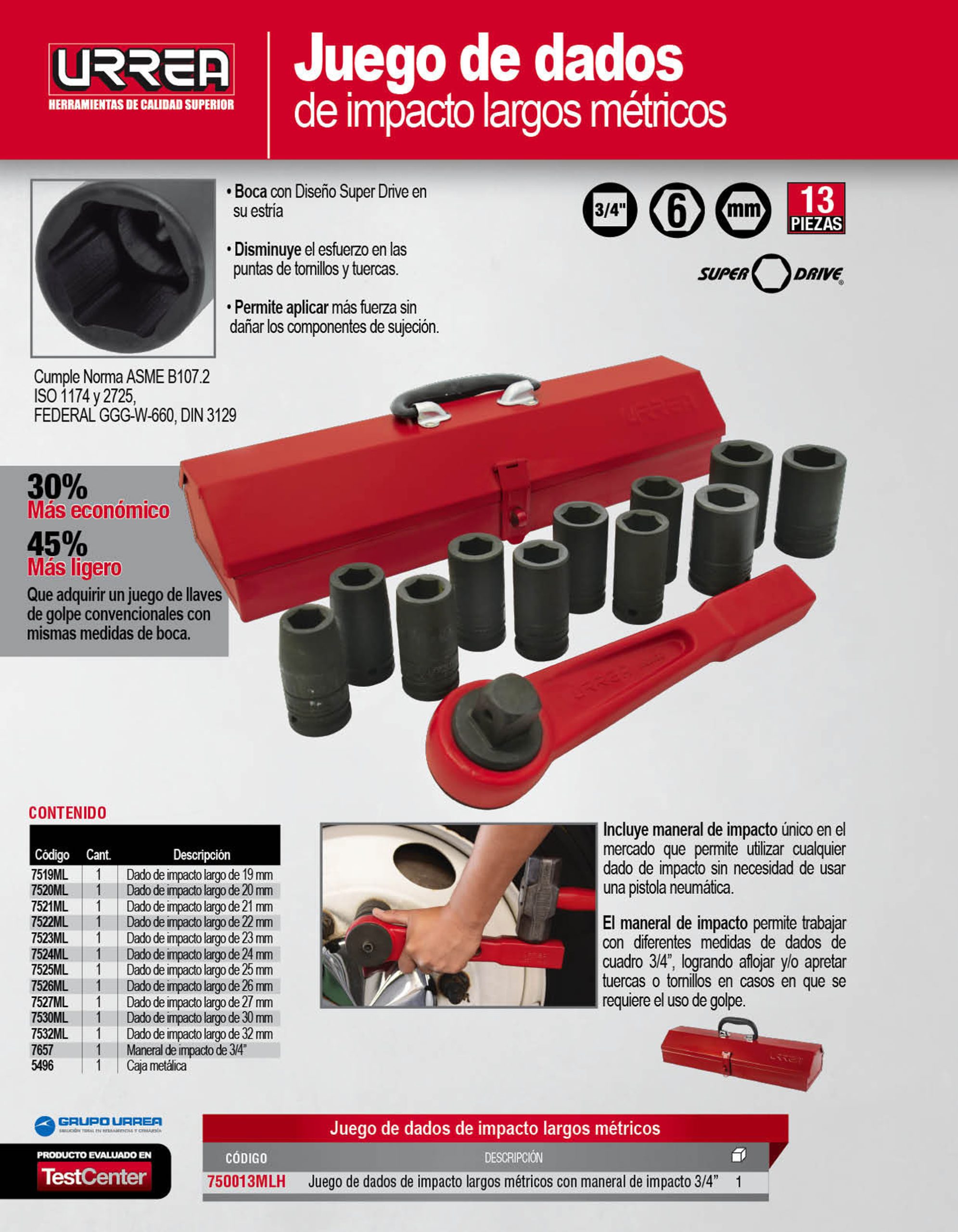 Caja metal 47.7 x 14.4 x 9cm. Dado imp 3/4″ largo 6pts 19mm. Dado imp 3/4″ largo 6pts 20mm. Dado imp 3/4″ largo 6pts 21mm. Dado imp 3/4″ largo 6pts 22mm. Dado imp 3/4″ largo 6pts 23mm. Dado imp 3/4″ largo 6pts 24mm. Dado imp 3/4″ largo 6pts 25mm. Dado imp 3/4″ largo 6pts 26mm. Dado imp 3/4″ largo 6pts 27mm. Dado imp 3/4″ largo 6pts 30mm. Dado imp 3/4″ largo 6pts 32mm. Etiq p/Jgo 750013MLH. Maneral de Impacto 3/4″
