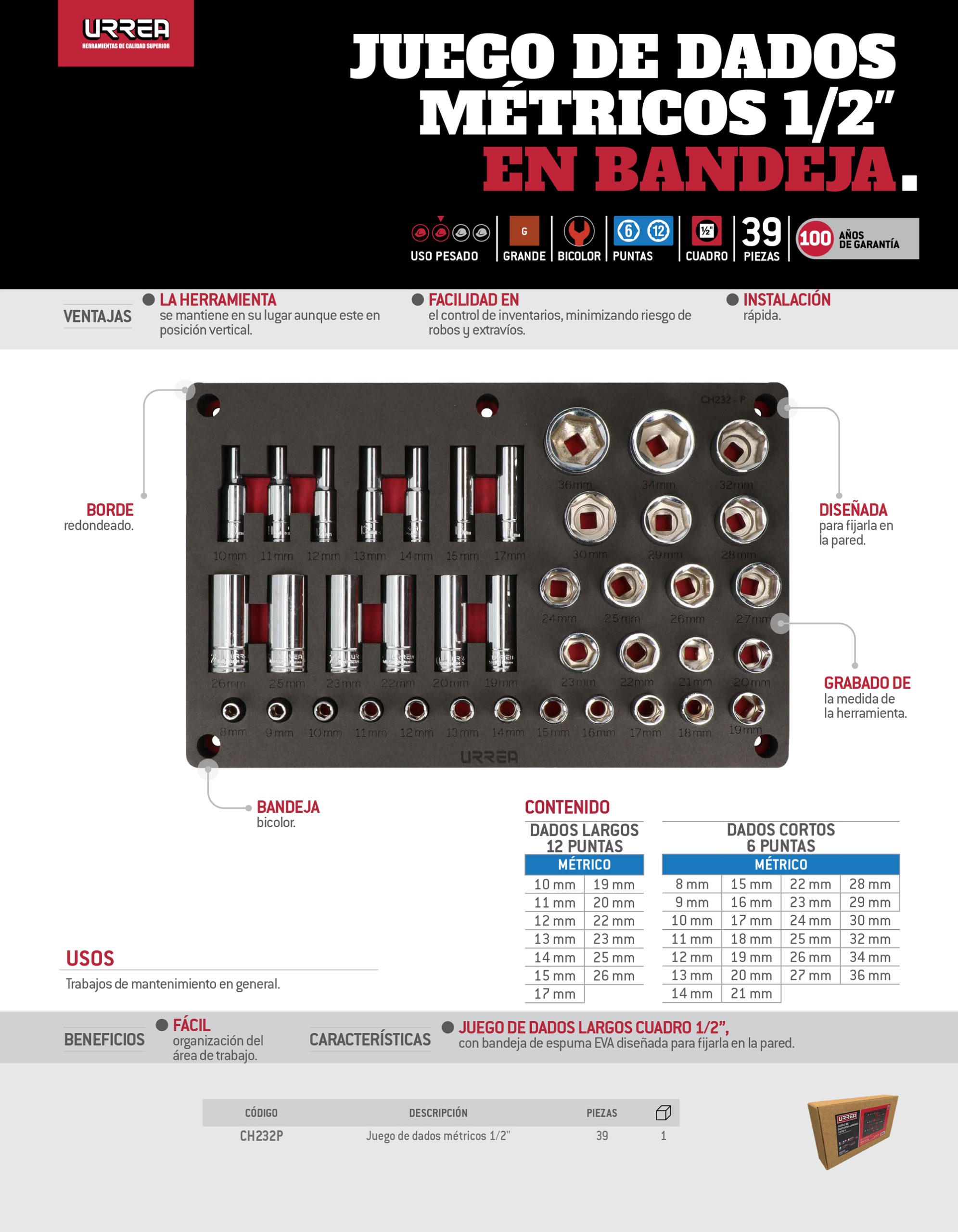 Juego de dados métricos cuadro de 1/2″ 39 piezas, CH232P-C Urrea