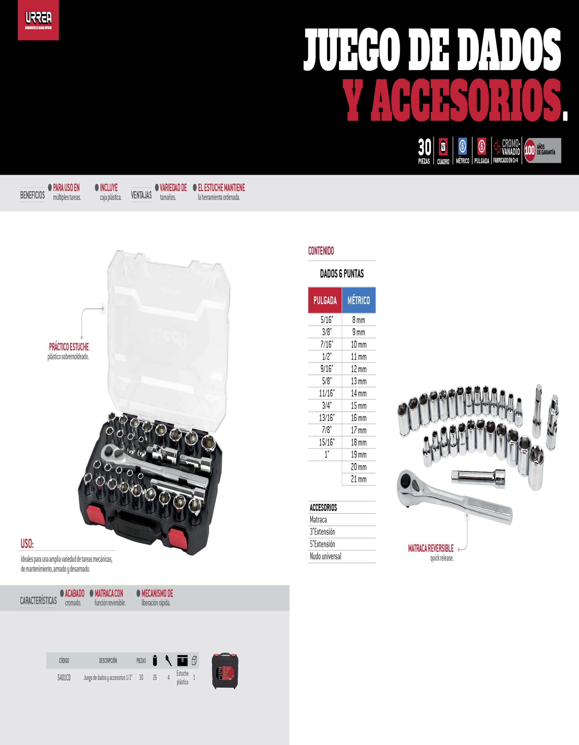Juego de dados y accesorios cuadro de 1/2″ combinado, 30 piezas Urrea
