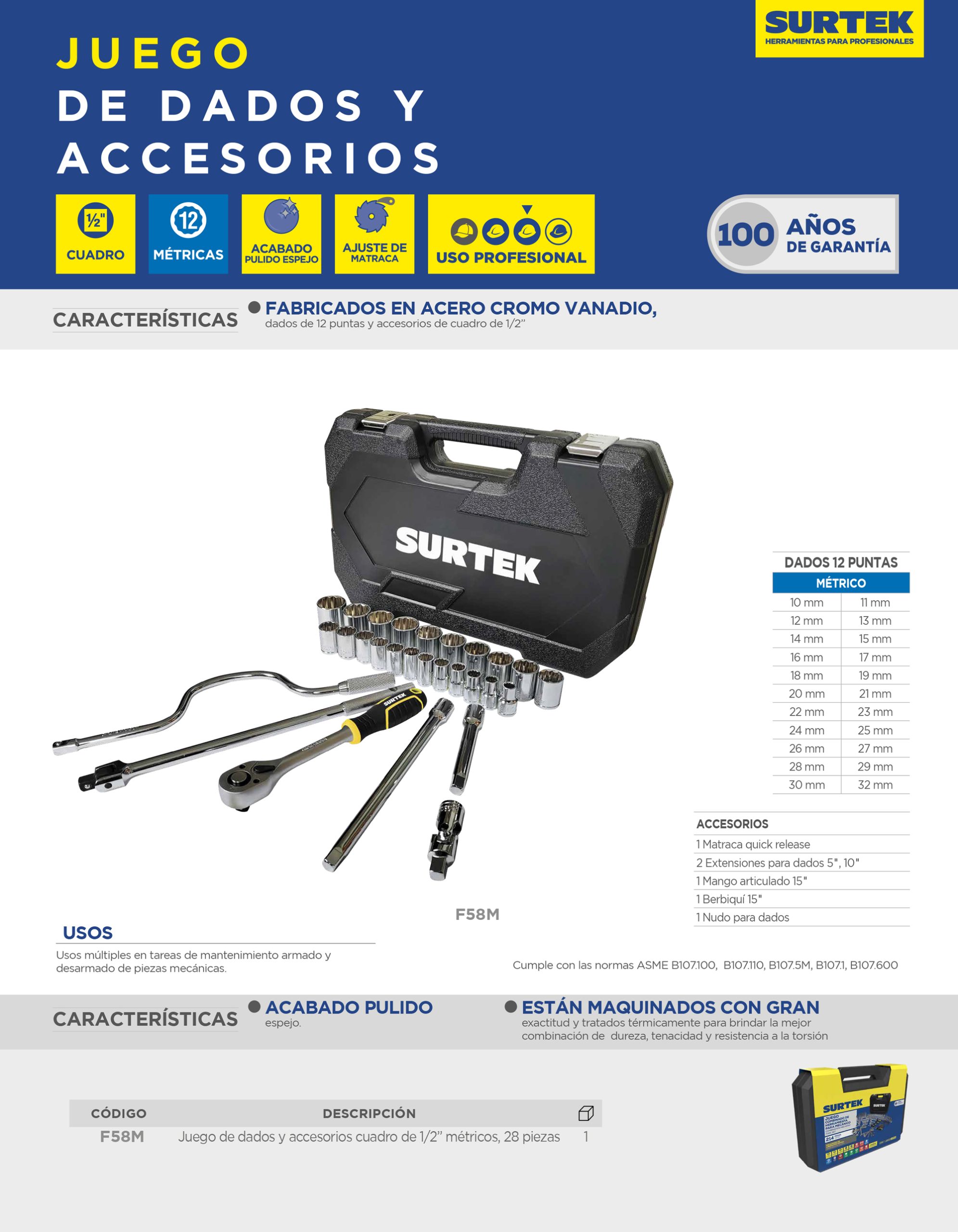 Juego de dados y accesorios cuadro de 1/2″ métrico, 28 piezas Surtek