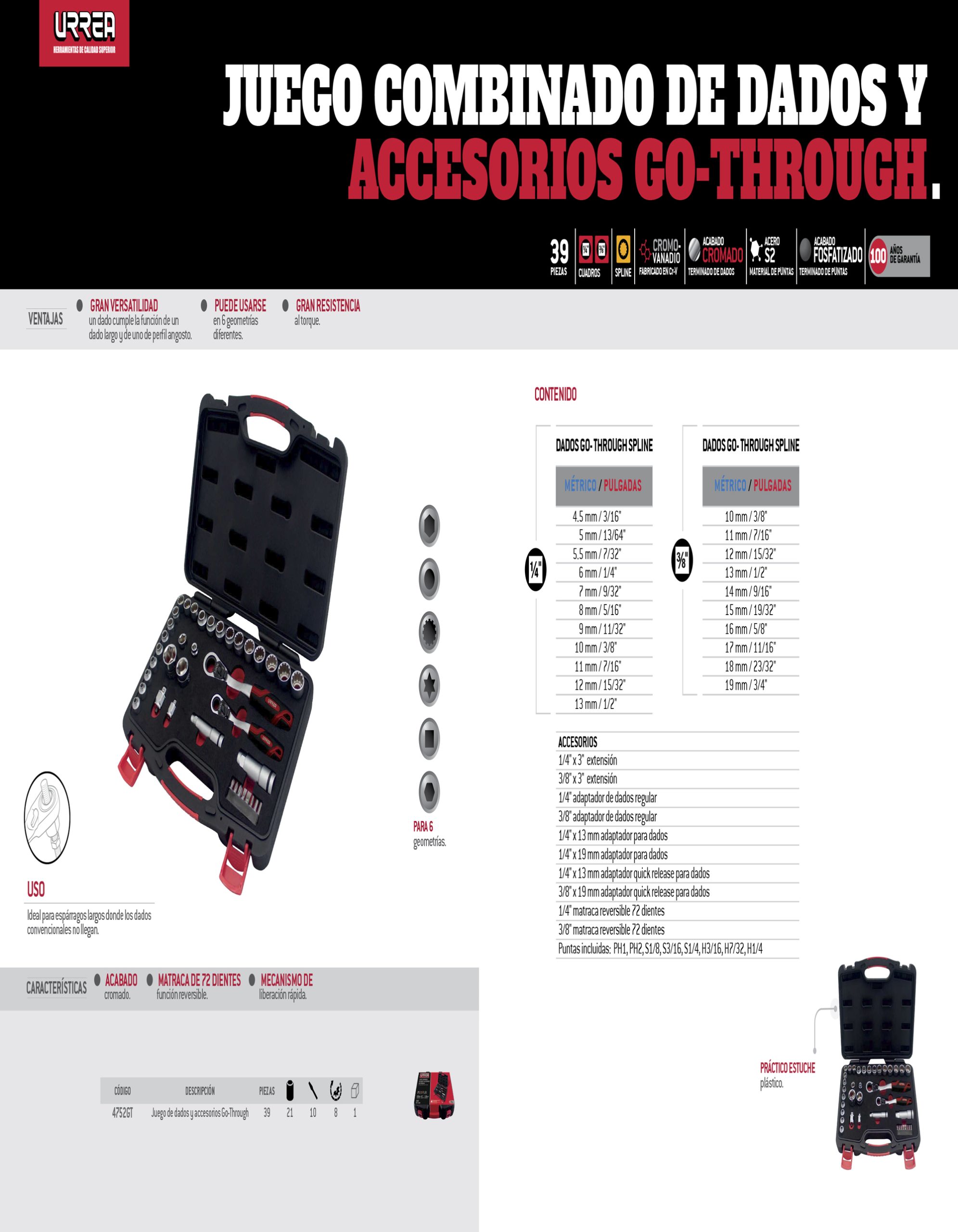 Tamaño de impulsor : 1/4″, 3/8″. Dados Go-Through Spline 1/4″: 4.5mm, 5mm, 5.5mm, 6mm, 7mm, 8mm, 9mm, 10mm, 11mm, 12mm, 13mm. Dados Go-Through Spline 3/8″: 10mm, 11mm, 12mm, 13mm, 14mm, 15mm, 16mm, 17mm, 18mm, 19mm. Extension Go-Through: 13mm, 19mm. Adaptador de dados regular: 1/4″, 3/8”. Adaptador para dados Go Through: 1/4″ x 13mm, 1/4″ x 19mm. Adaptador Quick Release para dados Go-Through: 1/4″ x 13mm, 3/8” x 19mm. Matraca Go-Through 72 dientes: 13mm, 19mm. Puntas incluidas: ph2, 1/8, 3/16, 1/4, h3/16, h7/32, h1/4.
