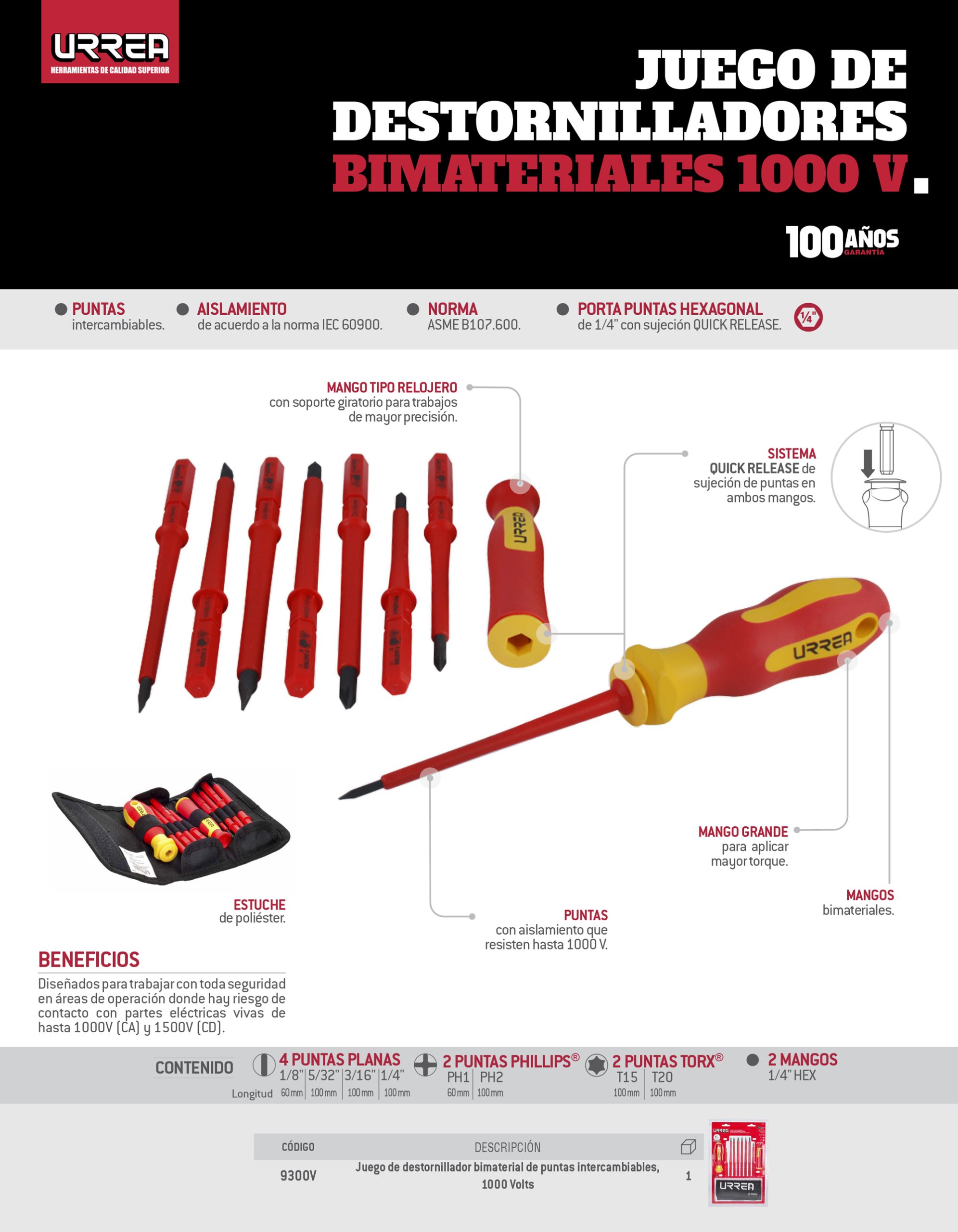 Juego de destornilladores con mango bimaterial y puntas intercambiables 1000 V, 10 piezas Urrea