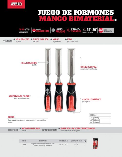 Juego de formones para madera con mango bimaterial 1/4″, 1/2″ y 3/4″, 3 piezas Urrea