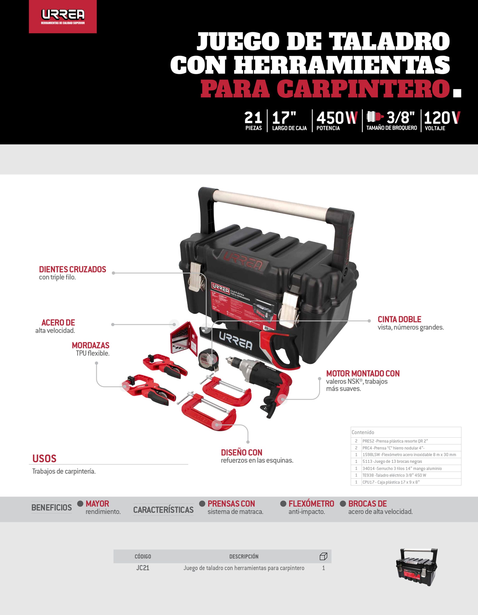 Juego de herramientas con taladro 21 piezas, caja plástica Urrea