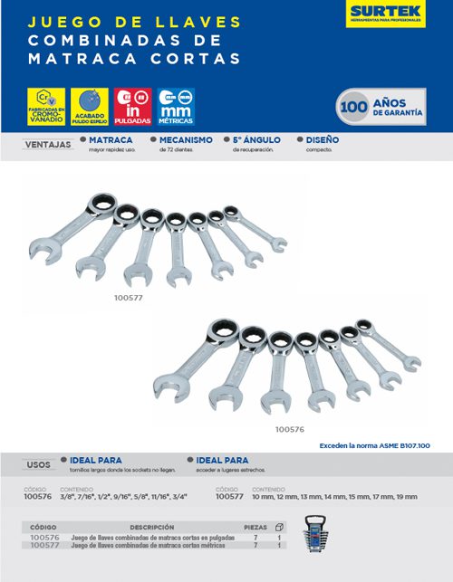 Juego de llaves combinadas cortas pulido espejo de matraca en pulg, 12 puntas,7 pz en rack Surtek