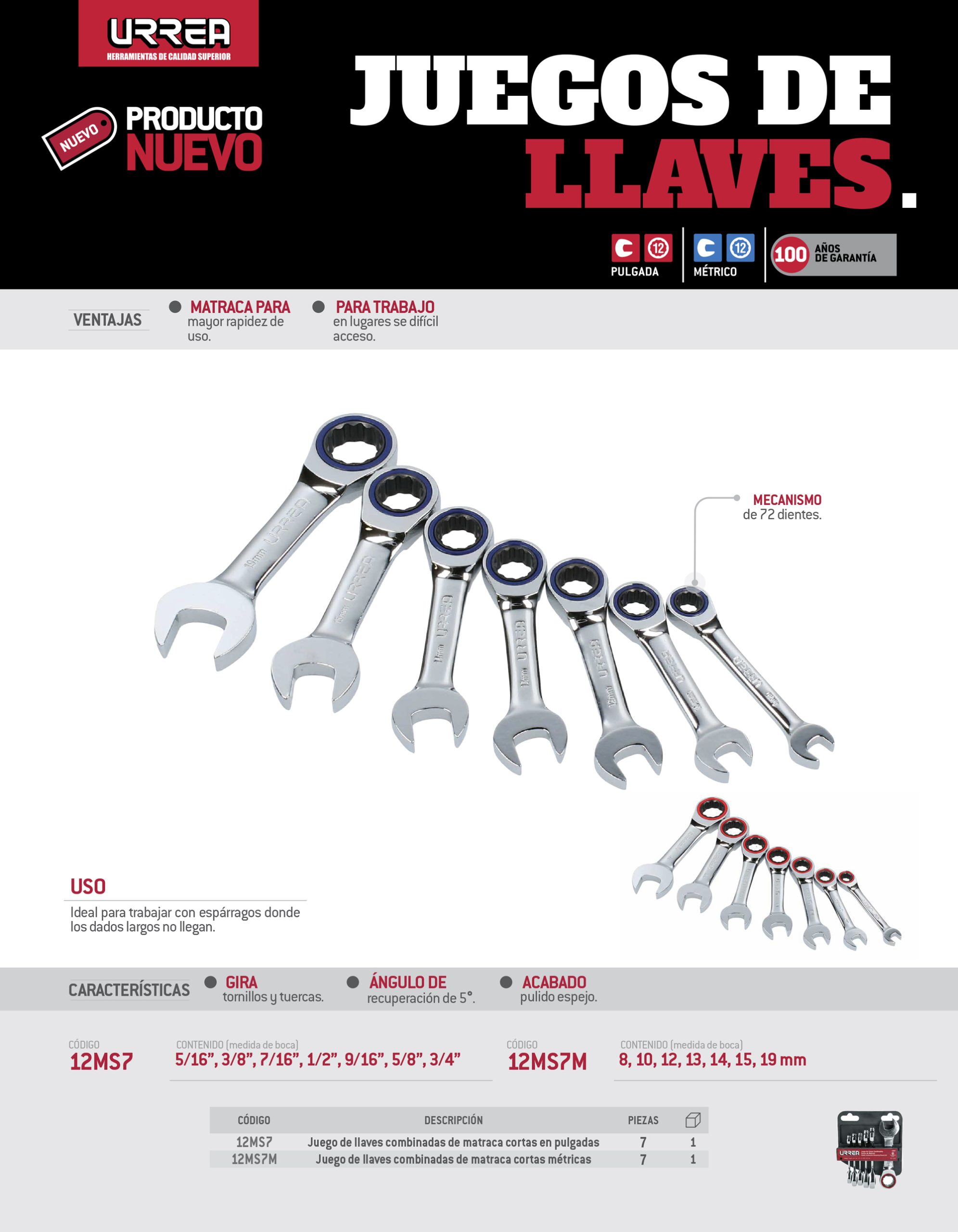 Juego de llaves combinadas cortas pulido espejo de matraca mét, 12 puntas,7 pz en rack Urrea