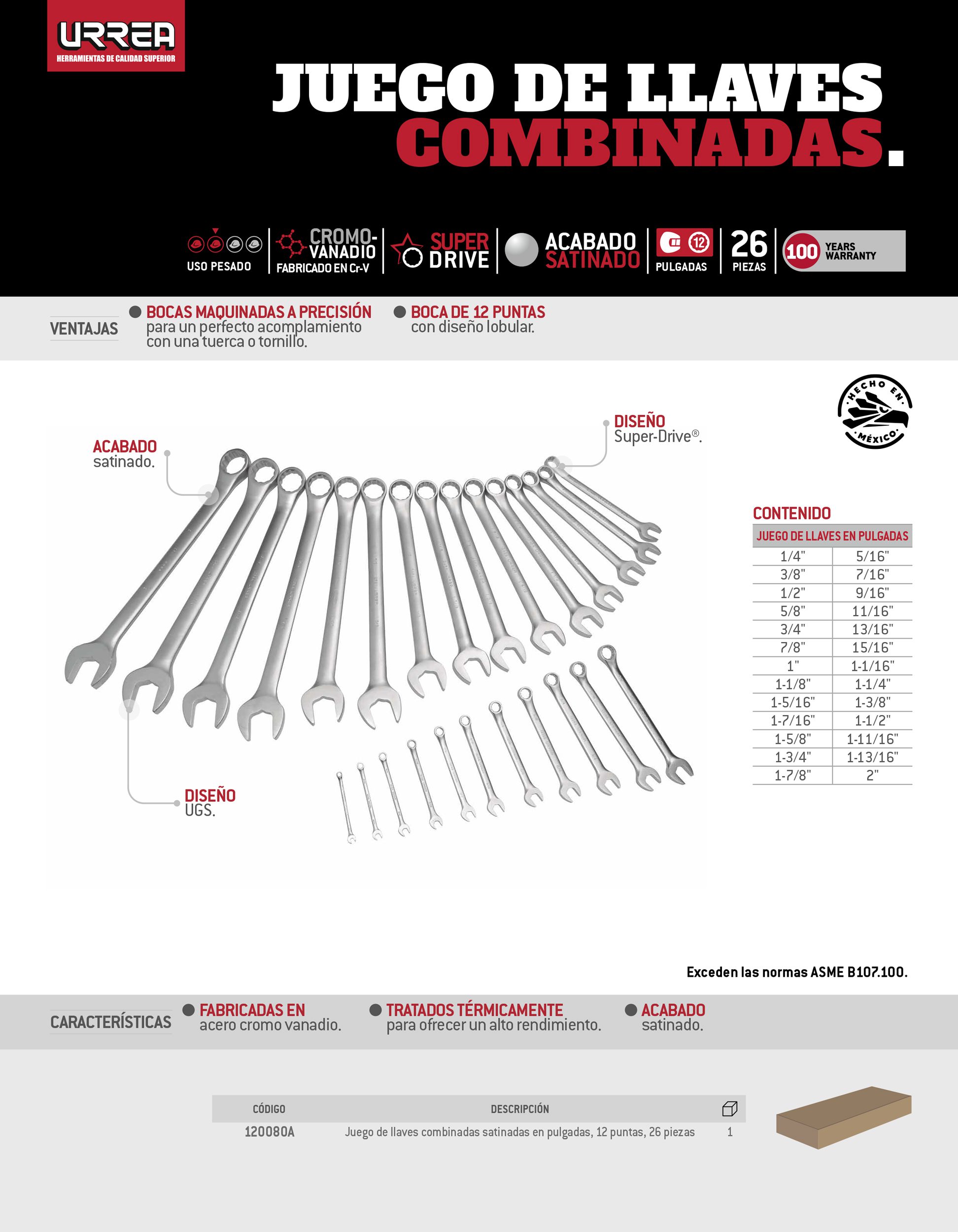 Juego de llaves combinadas satinadas en pulgadas, 12 puntas, 26 piezas en caja Urrea