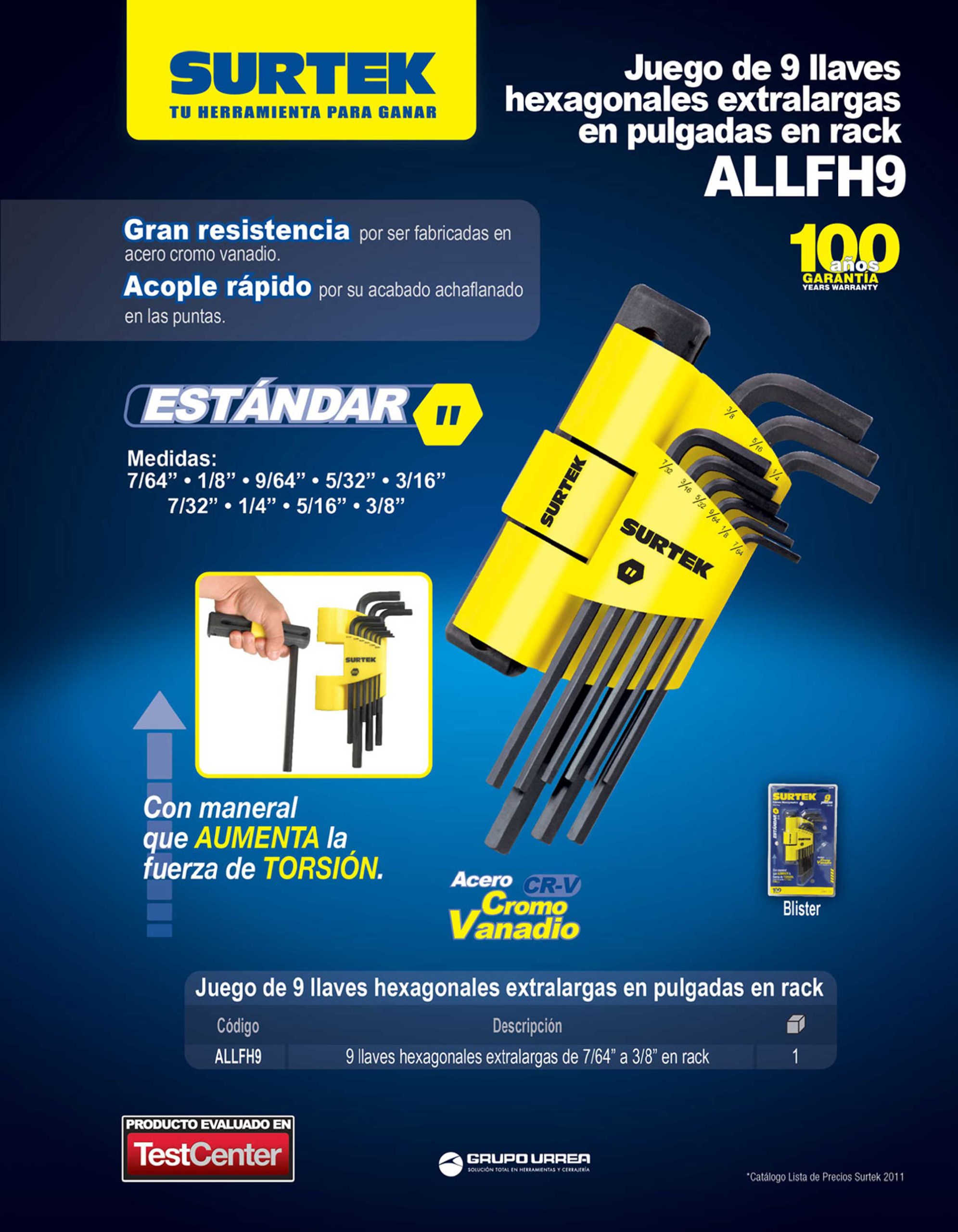 Juego de llaves extra largas hexagonales tipo “L”, métricas, 9 piezas en rack Surtek