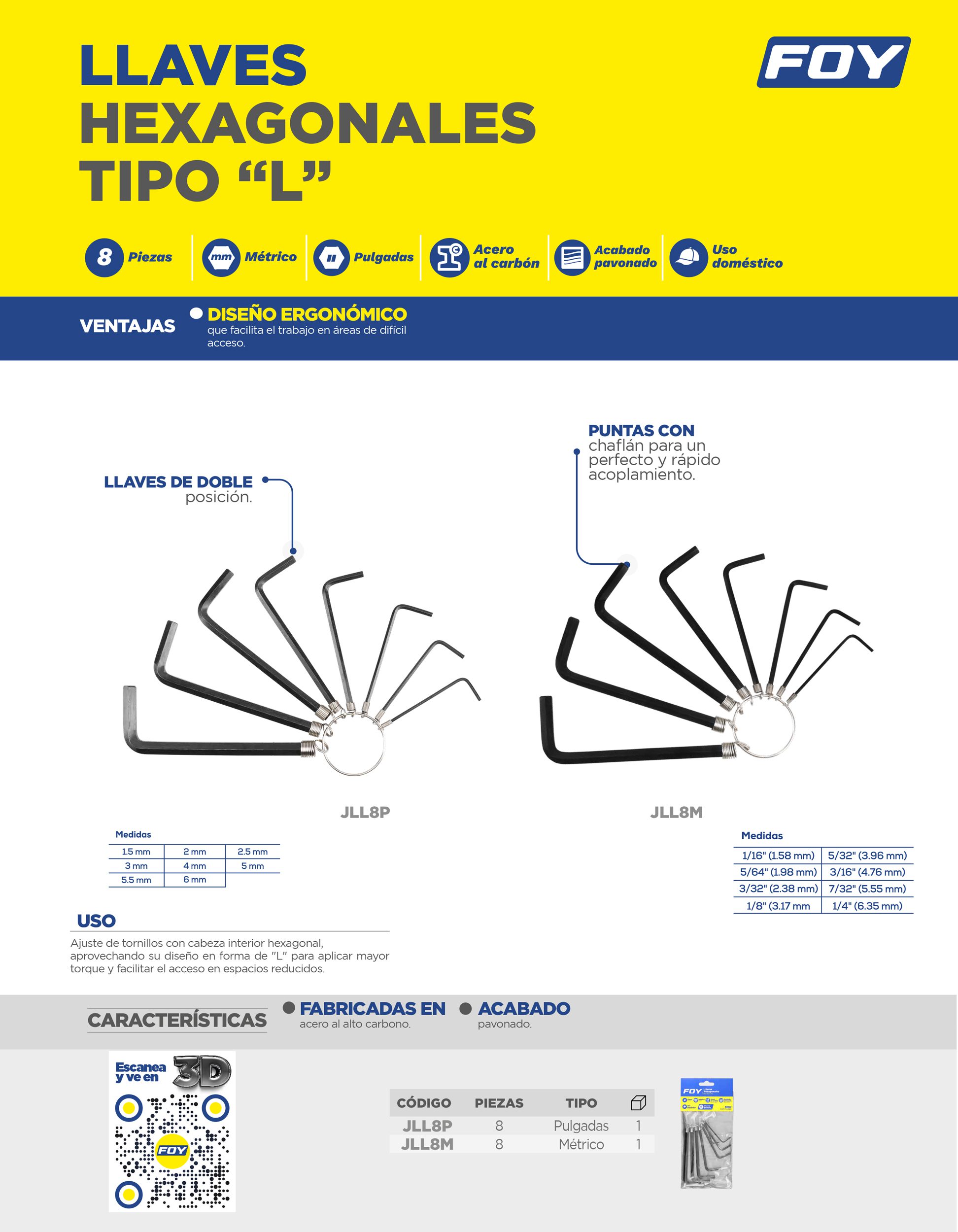 Juego de llaves hexagonales tipo “L”, métricas, 8 piezas en argolla Foy