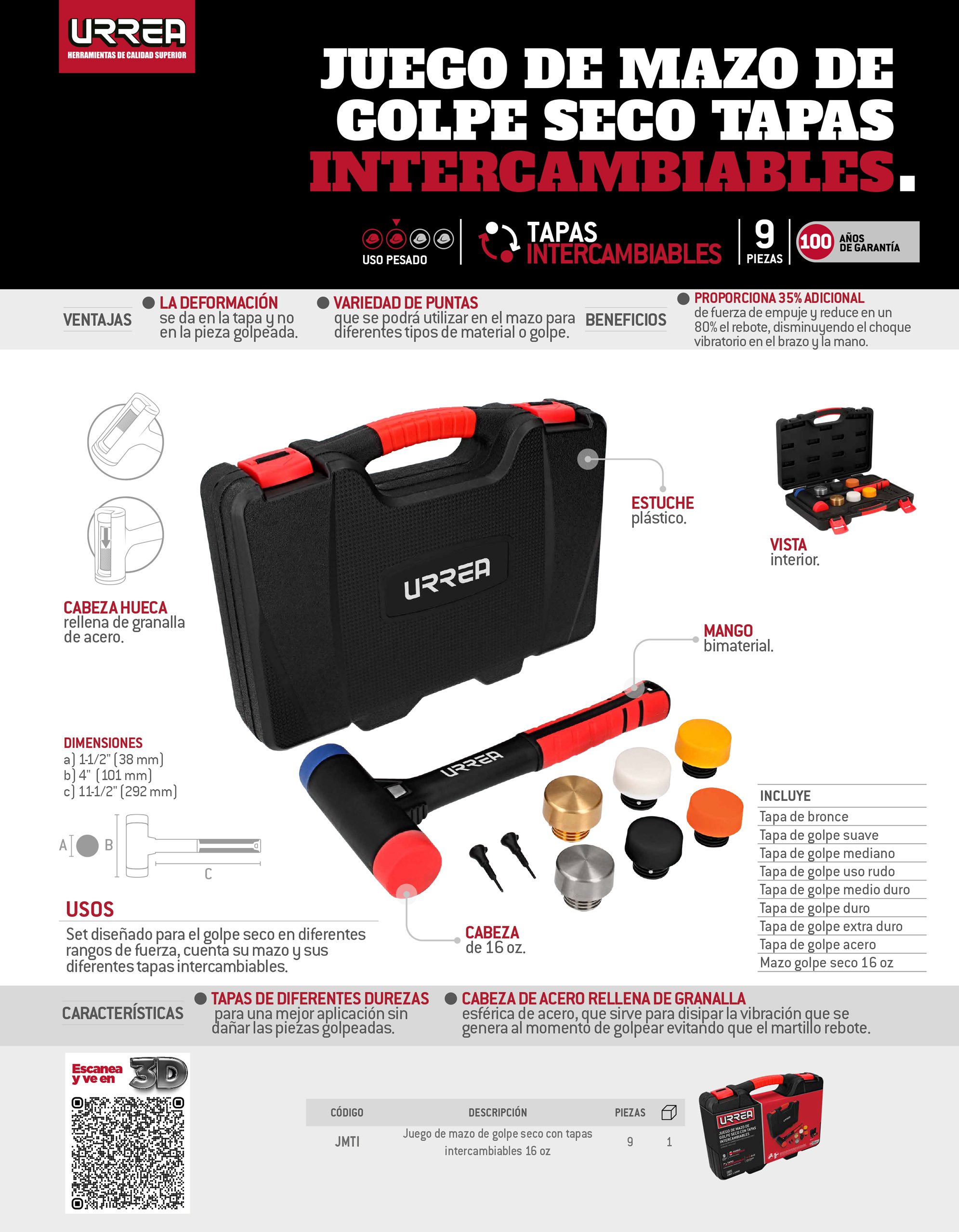 Juego de mazo de golpe seco con mango Rubber grip tapas intercambiables 16 oz, 9 piezas Urrea