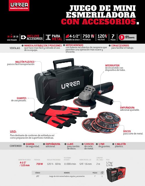 Mini esmeriladora, 1 par de guantes, 5 discos de corte, llave para cambio de disco y estuche.