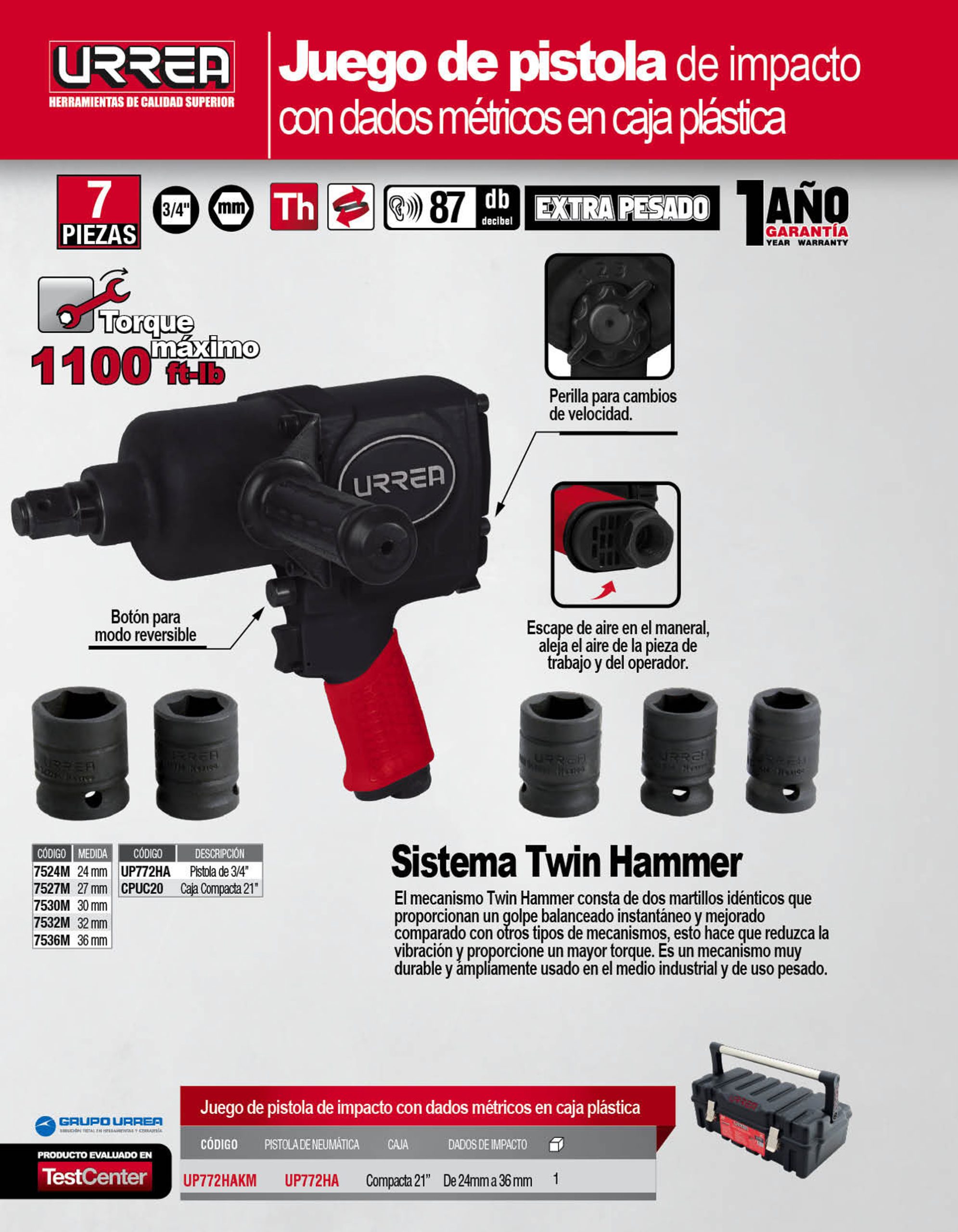 Juego de pistola de impacto neumática cuadro de 3/4″ y accesorios métricos, 7 piezas Urrea