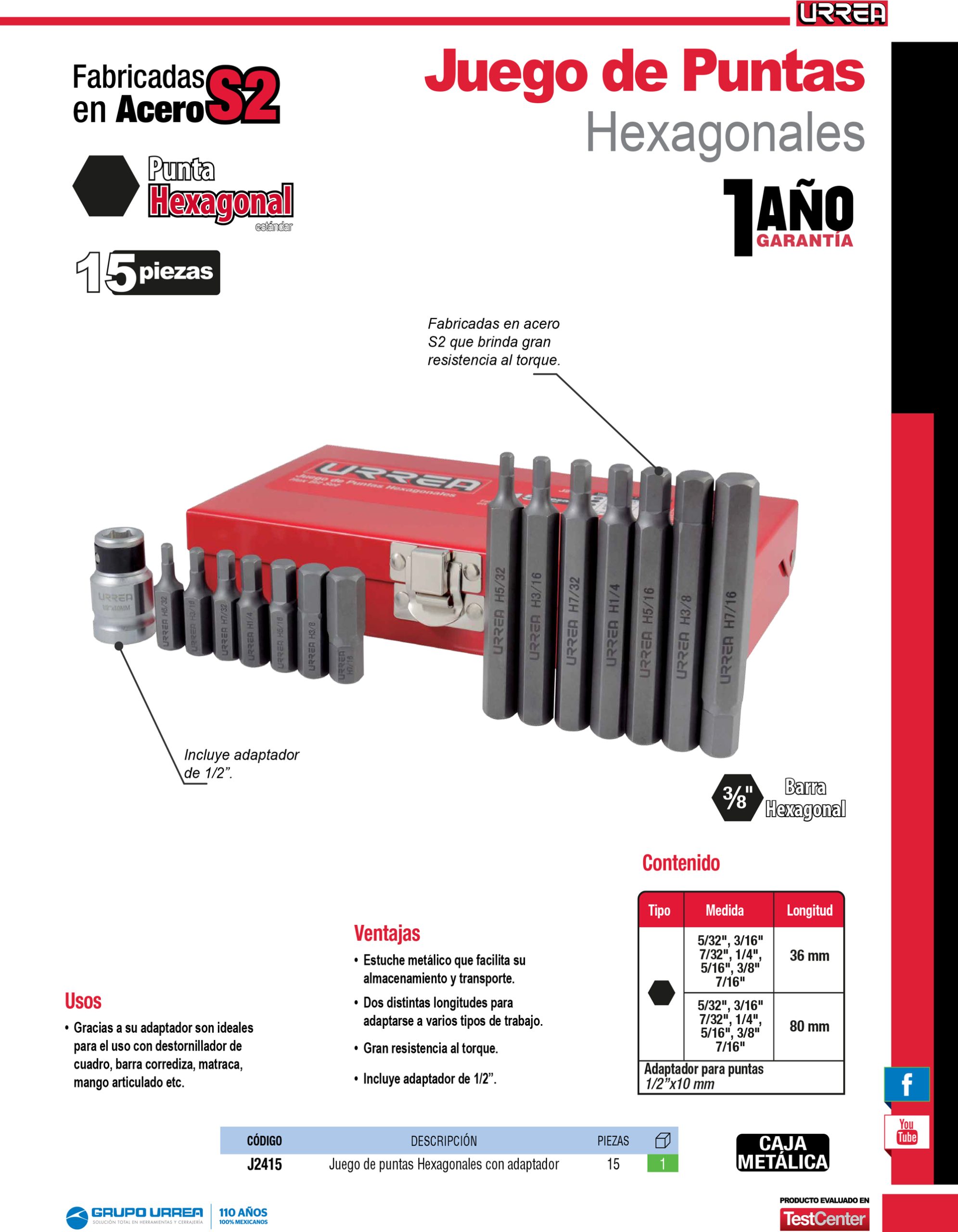 Juego de puntas hexagonales hexágono de 3/8″ in, con adaptador, 15 pz en caja metalica Urrea