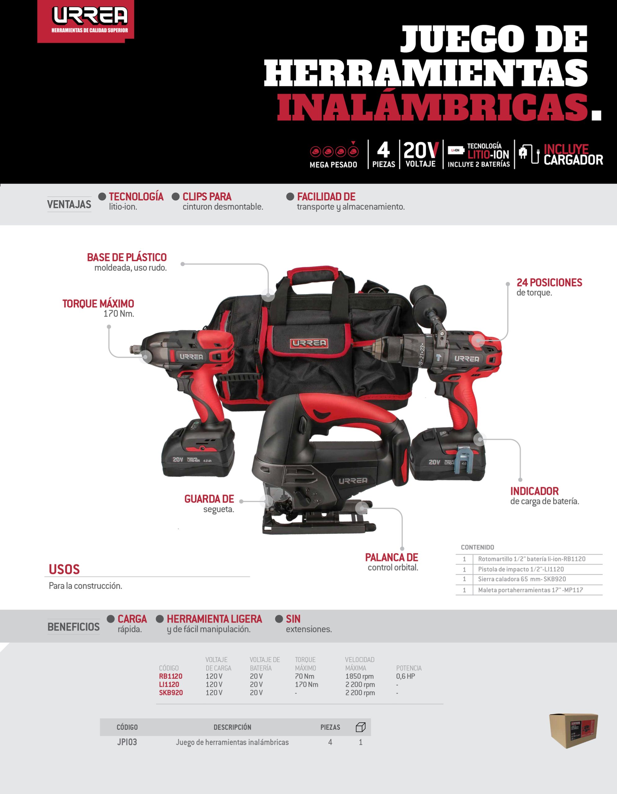 RB1120 – Rotomartillo 1/2″ batería li-ion 20V – 1pz, LI1120 – Pistola impacto 1/2″ 20V 170Nm – 1pz, MP117 – Maleta portaherramientas 17″ – 1pz, SKB920 – Sierra caladora 65mm 20V – 1pz.